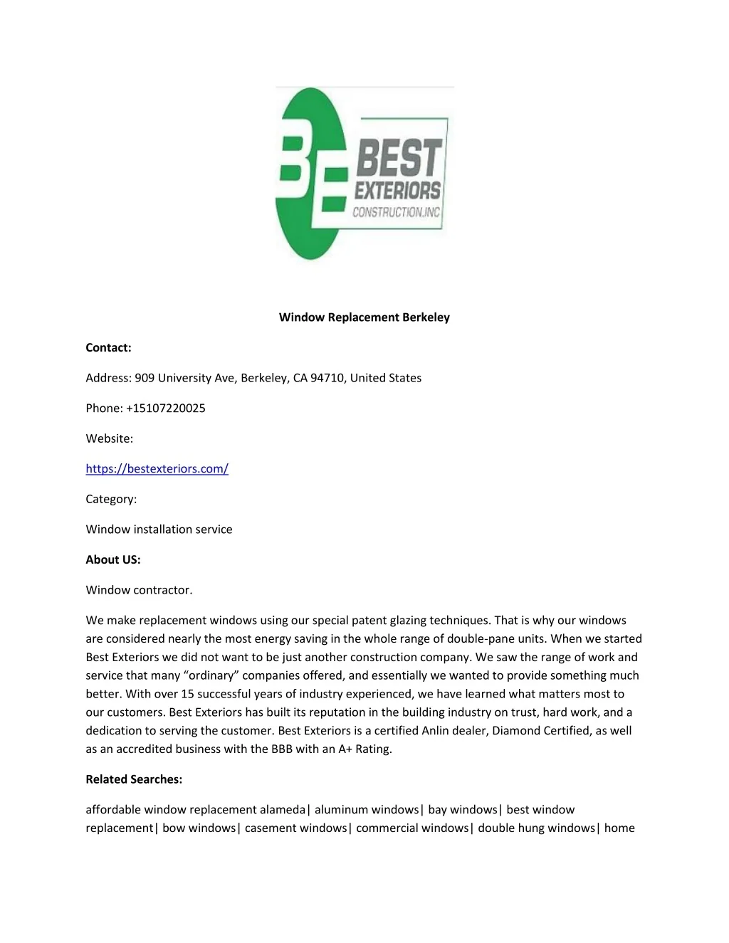 Contact:<br>Address: 909 University Ave, Berkeley, CA 94710, United States<br>Phone: 15107220025<br>Website:<br>https://bestexteriors.com/<br>Category:<br>Window installation service<br>About US:<br>Window contractor. <br>We make replacement windows using our special patent glazing techniques. That is why our windows are considered nearly the most energy saving in the whole range of double-pane units. When we started Best Exteriors we did not want to be just another construction company. We saw the range of work and service that many u201cordinaryu201d companies offered, and essentially we wanted to provide something much.
