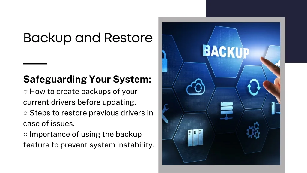 Backup and Restore Safeguarding Your System: ○ How to create backups of your current drivers before updating. ○ Steps to restore previous drivers in case of issues. ○ Importance of using the backup feature to prevent system instability.
