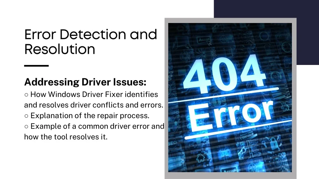 Error Detection and Resolution Addressing Driver Issues: ○ How Windows Driver Fixer identifies and resolves driver conflicts and errors. ○ Explanation of the repair process. ○ Example of a common driver error and how the tool resolves it.
