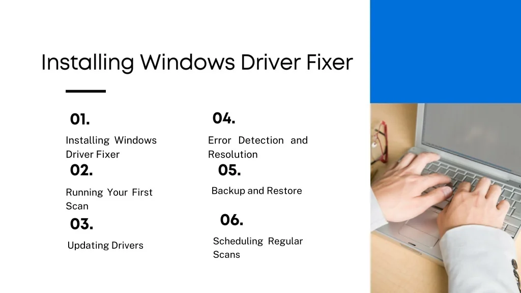 Installing Windows Driver Fixer 04. 01. Installing Windows Driver Fixer Error Detection and Resolution 02. 05. Backup and Restore Running Your First Scan 06. 03. Scheduling Regular Scans Updating Drivers