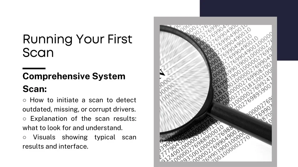 Running Your First Scan Comprehensive System Scan: ○ How to initiate a scan to detect outdated, missing, or corrupt drivers. ○ Explanation of the scan results: what to look for and understand. ○ Visuals showing typical scan results and interface.