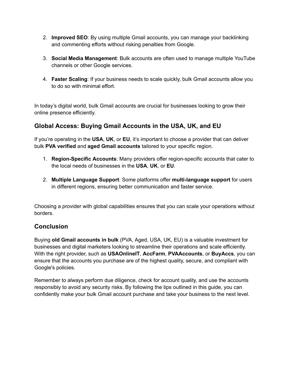 2. Improved SEO: By using multiple Gmail accounts, you can manage your backlinking and commenting efforts without risking penalties from Google. 3. Social Media Management: Bulk accounts are often used to manage multiple YouTube channels or other Google services. 4. Faster Scaling: If your business needs to scale quickly, bulk Gmail accounts allow you to do so with minimal effort. In today’s digital world, bulk Gmail accounts are crucial for businesses looking to grow their online presence efficiently. Global Access: Buying Gmail Accounts in the USA, UK, and EU If you’re operating in the USA, UK, or EU, it’s important to choose a provider that can deliver bulk PVA verified and aged Gmail accounts tailored to your specific region. 1. Region-Specific Accounts: Many providers offer region-specific accounts that cater to the local needs of businesses in the USA, UK, or EU. 2. Multiple Language Support: Some platforms offer multi-language support for users in different regions, ensuring better communication and faster service. Choosing a provider with global capabilities ensures that you can scale your operations without borders. Conclusion Buying old Gmail accounts in bulk (PVA, Aged, USA, UK, EU) is a valuable investment for businesses and digital marketers looking to streamline their operations and scale efficiently. With the right provider, such as USAOnlineIT, AccFarm, PVAAccounts, or BuyAccs, you can ensure that the accounts you purchase are of the highest quality, secure, and compliant with Google's policies. Remember to always perform due diligence, check for account quality, and use the accounts responsibly to avoid any security risks. By following the tips outlined in this guide, you can confidently make your bulk Gmail account purchase and take your business to the next level.