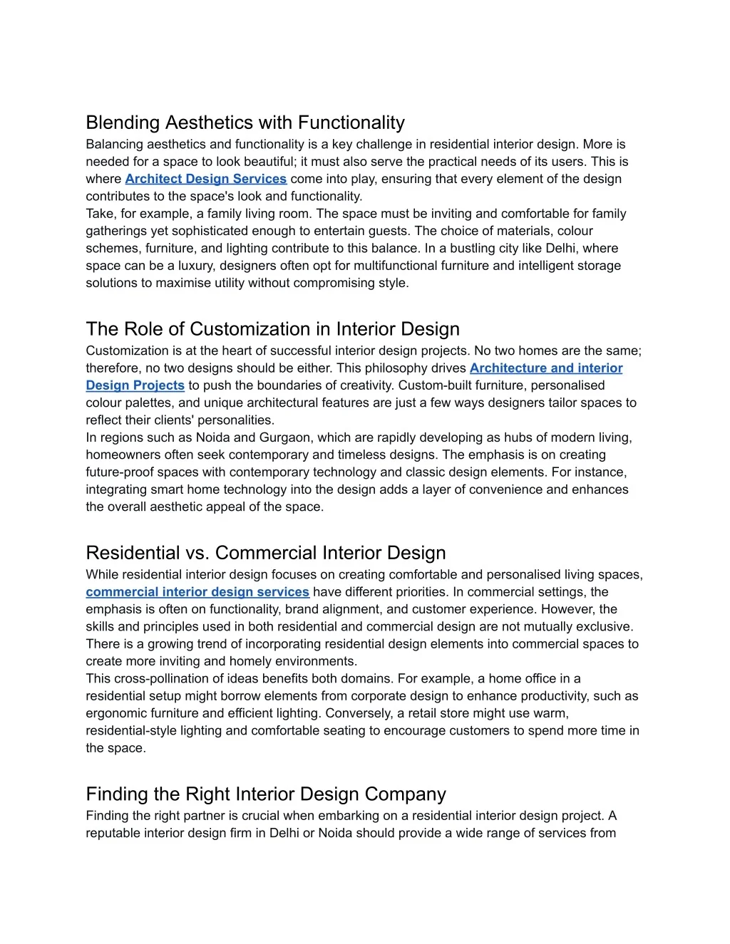 Blending Aesthetics with Functionality Balancing aesthetics and functionality is a key challenge in residential interior design. More is needed for a space to look beautiful; it must also serve the practical needs of its users. This is where Architect Design Services come into play, ensuring that every element of the design contributes to the space's look and functionality. Take, for example, a family living room. The space must be inviting and comfortable for family gatherings yet sophisticated enough to entertain guests. The choice of materials, colour schemes, furniture, and lighting contribute to this balance. In a bustling city like Delhi, where space can be a luxury, designers often opt for multifunctional furniture and intelligent storage solutions to maximise utility without compromising style. The Role of Customization in Interior Design Customization is at the heart of successful interior design projects. No two homes are the same; therefore, no two designs should be either. This philosophy drives Architecture and interior Design Projects to push the boundaries of creativity. Custom-built furniture, personalised colour palettes, and unique architectural features are just a few ways designers tailor spaces to reflect their clients' personalities. In regions such as Noida and Gurgaon, which are rapidly developing as hubs of modern living, homeowners often seek contemporary and timeless designs. The emphasis is on creating future-proof spaces with contemporary technology and classic design elements. For instance, integrating smart home technology into the design adds a layer of convenience and enhances the overall aesthetic appeal of the space. Residential vs. Commercial Interior Design While residential interior design focuses on creating comfortable and personalised living spaces, commercial interior design services have different priorities. In commercial settings, the emphasis is often on functionality, brand alignment, and customer experience. However, the skills and principles used in both residential and commercial design are not mutually exclusive. There is a growing trend of incorporating residential design elements into commercial spaces to create more inviting and homely environments. This cross-pollination of ideas benefits both domains. For example, a home office in a residential setup might borrow elements from corporate design to enhance productivity, such as ergonomic furniture and efficient lighting. Conversely, a retail store might use warm, residential-style lighting and comfortable seating to encourage customers to spend more time in the space. Finding the Right Interior Design Company Finding the right partner is crucial when embarking on a residential interior design project. A reputable interior design firm in Delhi or Noida should provide a wide range of services from