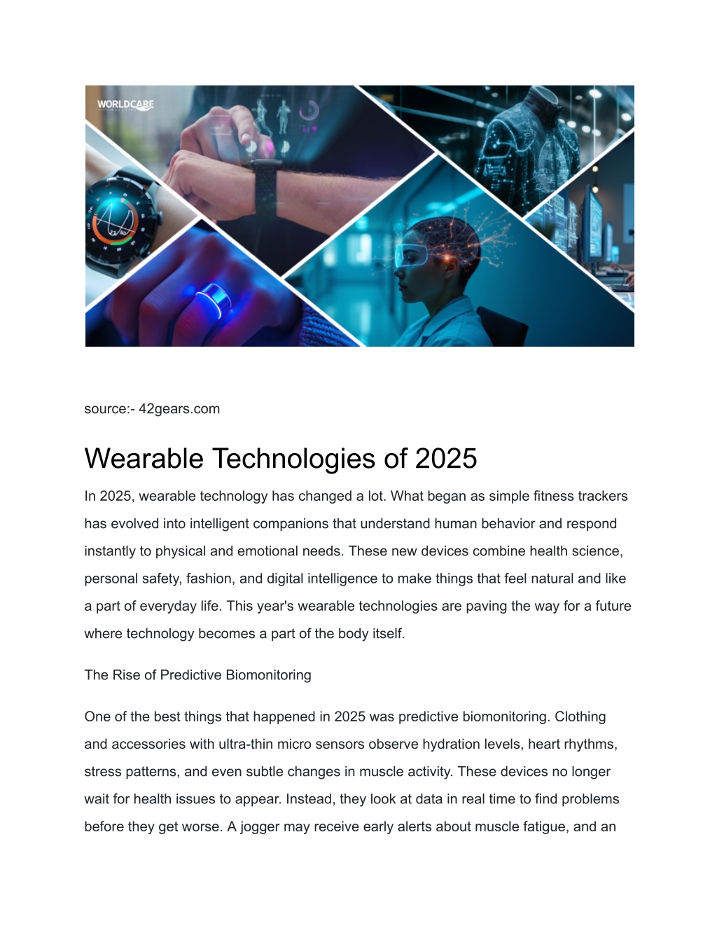 source:- 42gears.com Wearable Technologies of 2025 In 2025, wearable technology has changed a lot. What began as simple fitness trackers has evolved into intelligent companions that understand human behavior and respond instantly to physical and emotional needs. These new devices combine health science, personal safety, fashion, and digital intelligence to make things that feel natural and like a part of everyday life. This year's wearable technologies are paving the way for a future where technology becomes a part of the body itself. The Rise of Predictive Biomonitoring One of the best things that happened in 2025 was predictive biomonitoring. Clothing and accessories with ultra-thin micro sensors observe hydration levels, heart rhythms, stress patterns, and even subtle changes in muscle activity. These devices no longer wait for health issues to appear. Instead, they look at data in real time to find problems before they get worse. A jogger may receive early alerts about muscle fatigue, and an