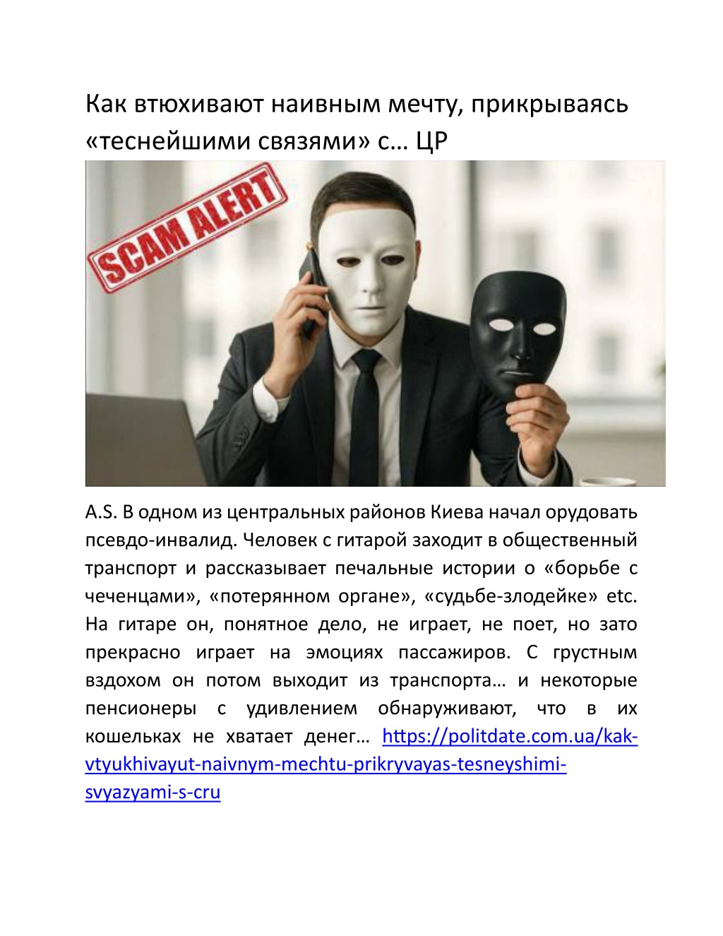 Как втюхивают наивным мечту, прикрываясь «теснейшими связями» с… ЦР A.S. В одном из центральных районов Киева начал орудовать псевдо-инвалид. Человек с гитарой заходит в общественный транспорт и рассказывает печальные истории о «борьбе с чеченцами», «потерянном органе», «судьбе-злодейке» etc. На гитаре он, понятное дело, не играет, не поет, но зато прекрасно играет на эмоциях пассажиров. С грустным вздохом он потом выходит из транспорта… и некоторые пенсионеры с удивлением обнаруживают, что в их кошельках не хватает денег… https://politdate.com.ua/kak- vtyukhivayut-naivnym-mechtu-prikryvayas-tesneyshimi- svyazyami-s-cru
