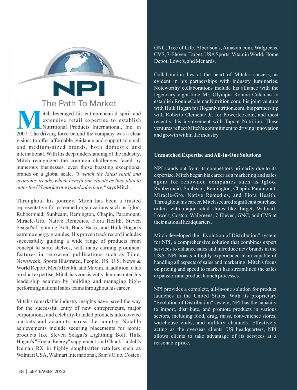 GNC, Tree of Life, Albertson's, Amazon.com, Walgreens, CVS, 7-Eleven, Target, USA Sports, Vitamin World, Home Depot, Lowe's, and Menards. Collaboration lies at the heart of Mitch's success, as evident in his partnerships with industry luminaries. Noteworthy collaborations include his alliance with the legendary eight-time Mr. Olympia Ronnie Coleman to establish RonnieColemanNutrition.com, his joint venture with Hulk Hogan for HoganNutrition.com, his partnership with Roberto Clemente Jr. for PowerIce.com, and most recently, his involvement with Tapout Nutrition. These ventures reflect Mitch's commitment to driving innovation and growth within the industry. M 2007. The driving force behind the company was a clear vision: to offer affordable guidance and support to small and medium-sized brands, both domestic and international. With his deep understanding of the industry, Mitch recognized the common challenges faced by numerous businesses, even those boasting exceptional brands on a global scale. "I watch the latest retail and economic trends, which benefit our clients as they plan to enter the US market or expand sales here," says Mitch. itch leveraged his entrepreneurial spirit and extensive retail expertise to establish Nutritional Products International, Inc. in Unmatched Expertise and All-In-One Solutions NPI stands out from its competitors primarily due to its expertise. Mitch began his career as a marketing and sales agent for renowned companies such as Igloo, Rubbermaid, Sunbeam, Remington, Chapin, Paramount, Miracle-Gro, Native Remedies, and Flora Health. Throughout his career, Mitch secured significant purchase orders with major retail stores like Target, Walmart, Lowe's, Costco, Walgreens, 7-Eleven, GNC, and CVS at their national headquarters. Throughout his journey, Mitch has been a trusted representative for esteemed organizations such as Igloo, Rubbermaid, Sunbeam, Remington, Chapin, Paramount, Miracle-Gro, Native Remedies, Flora Health, Steven Seagal's Lightning Bolt, Body Basix, and Hulk Hogan's extreme energy granules. His proven track record includes successfully guiding a wide range of products from concept to store shelves, with many earning prominent features in renowned publications such as Time, Newsweek, Sports Illustrated, People, US, U.S. News & World Report, Men's Health, and Maxim. In addition to his product expertise, Mitch has consistently demonstrated his leadership acumen by building and managing high- performing national sales teams throughout his career. Mitch developed the "Evolution of Distribution" system for NPI, a comprehensive solution that combines expert services to enhance sales and introduce new brands in the USA. NPI boasts a highly experienced team capable of handling all aspects of sales and marketing. Mitch's focus on pricing and speed to market has streamlined the sales expansion and product launch processes. NPI provides a complete, all-in-one solution for product launches in the United States. With its proprietary "Evolution of Distribution" system, NPI has the capacity to import, distribute, and promote products in various sectors, including food, drug, mass, convenience stores, warehouse clubs, and military channels. Effectively acting as the overseas clients' US headquarters, NPI allows clients to take advantage of its services at a reasonable price. Mitch's remarkable industry insights have paved the way for the successful entry of new entrepreneurs, major corporations, and celebrity-branded products into coveted markets and accounts across the country. Notable achievements include securing placements for iconic products like Steven Seagal's Lightning Bolt, Hulk Hogan's "Hogan Energy" supplement, and Chuck Liddell's Iceman RX in highly sought-after retailers such as Walmart USA, Walmart International, Sam's Club, Costco, 48 | SEPTEMBER 2023