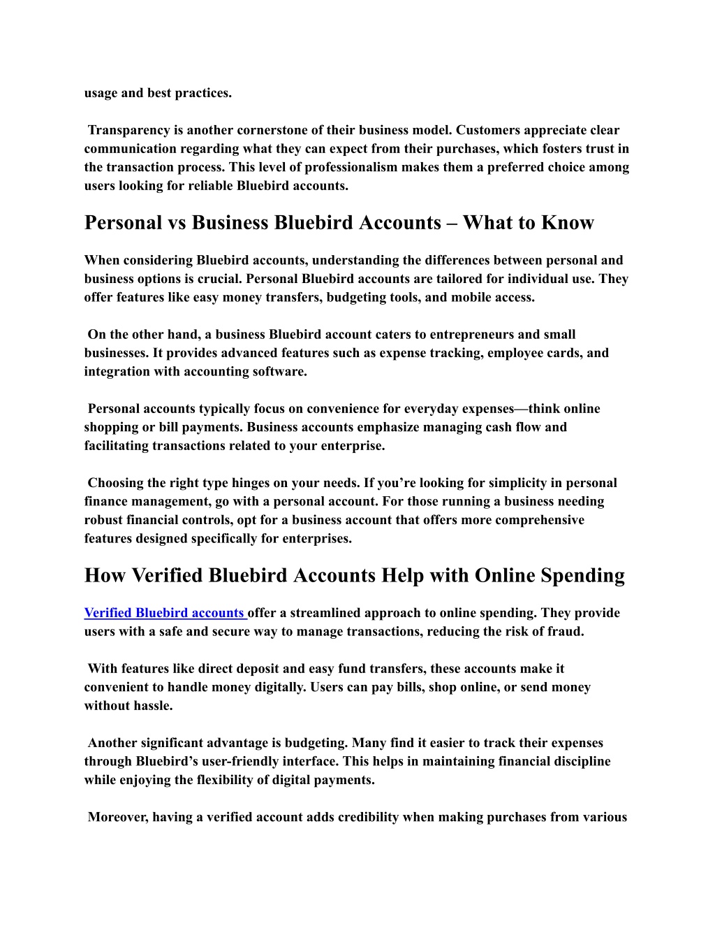 4. usage and best practices. Transparency is another cornerstone of their business model. Customers appreciate clear communication regarding what they can expect from their purchases, which fosters trust in the transaction process. This level of professionalism makes them a preferred choice among users looking for reliable Bluebird accounts. Personal vs Business Bluebird Accounts – What to Know When considering Bluebird accounts, understanding the differences between personal and business options is crucial. Personal Bluebird accounts are tailored for individual use. They offer features like easy money transfers, budgeting tools, and mobile access. On the other hand, a business Bluebird account caters to entrepreneurs and small businesses. It provides advanced features such as expense tracking, employee cards, and integration with accounting software. Personal accounts typically focus on convenience for everyday expenses—think online shopping or bill payments. Business accounts emphasize managing cash flow and facilitating transactions related to your enterprise. Choosing the right type hinges on your needs. If you’re looking for simplicity in personal finance management, go with a personal account. For those running a business needing robust financial controls, opt for a business account that offers more comprehensive features designed specifically for enterprises. How Verified Bluebird Accounts Help with Online Spending Verified Bluebird accounts offer a streamlined approach to online spending. They provide users with a safe and secure way to manage transactions, reducing the risk of fraud. With features like direct deposit and easy fund transfers, these accounts make it convenient to handle money digitally. Users can pay bills, shop online, or send money without hassle. Another significant advantage is budgeting. Many find it easier to track their expenses through Bluebird’s user-friendly interface. This helps in maintaining financial discipline while enjoying the flexibility of digital payments. Moreover, having a verified account adds credibility when making purchases from various