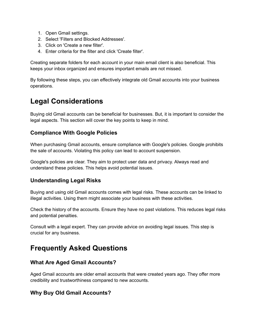 1. Open Gmail settings. 2. Select 'Filters and Blocked Addresses'. 3. Click on 'Create a new filter'. 4. Enter criteria for the filter and click 'Create filter'. Creating separate folders for each account in your main email client is also beneficial. This keeps your inbox organized and ensures important emails are not missed. By following these steps, you can effectively integrate old Gmail accounts into your business operations. Legal Considerations Buying old Gmail accounts can be beneficial for businesses. But, it is important to consider the legal aspects. This section will cover the key points to keep in mind. Compliance With Google Policies When purchasing Gmail accounts, ensure compliance with Google's policies. Google prohibits the sale of accounts. Violating this policy can lead to account suspension. Google's policies are clear. They aim to protect user data and privacy. Always read and understand these policies. This helps avoid potential issues. Understanding Legal Risks Buying and using old Gmail accounts comes with legal risks. These accounts can be linked to illegal activities. Using them might associate your business with these activities. Check the history of the accounts. Ensure they have no past violations. This reduces legal risks and potential penalties. Consult with a legal expert. They can provide advice on avoiding legal issues. This step is crucial for any business. Frequently Asked Questions What Are Aged Gmail Accounts? Aged Gmail accounts are older email accounts that were created years ago. They offer more credibility and trustworthiness compared to new accounts. Why Buy Old Gmail Accounts?