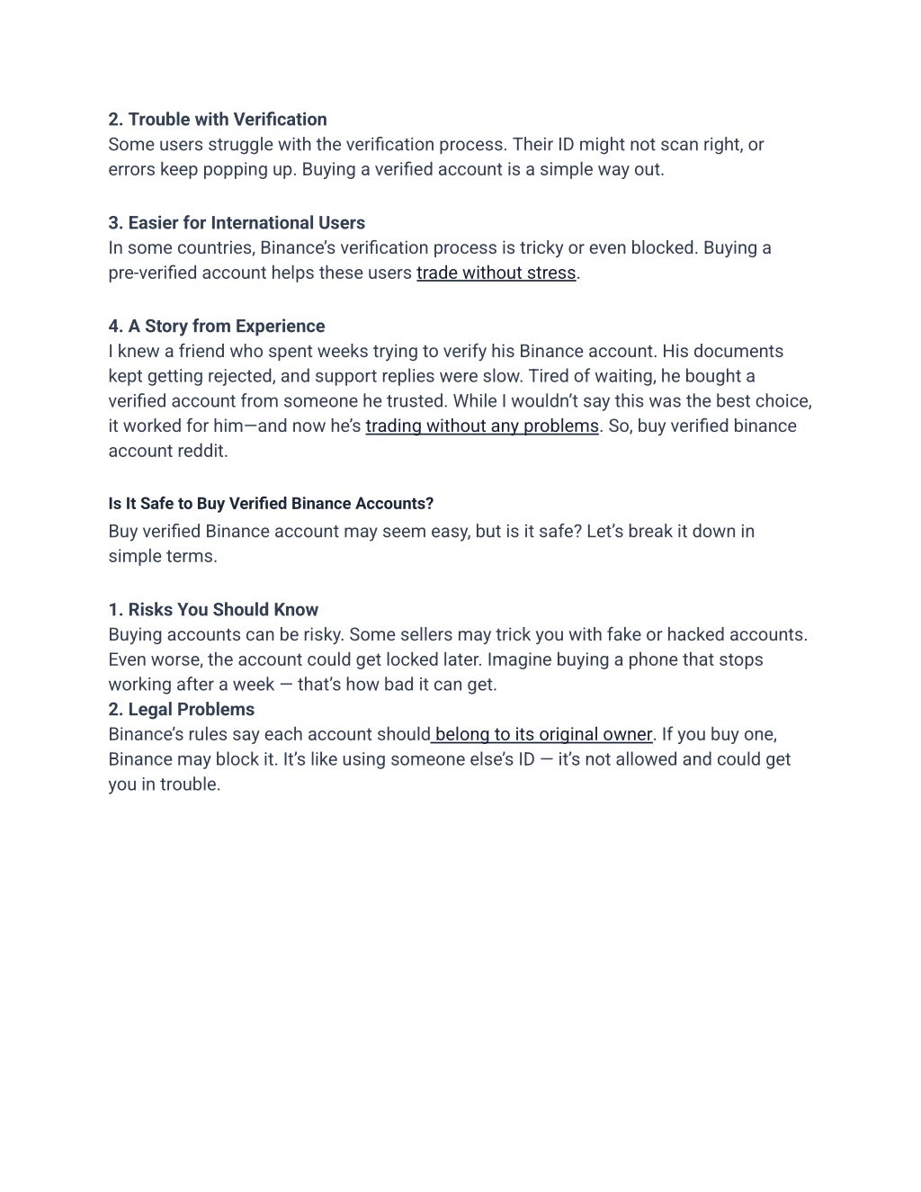 2. Trouble with Verification Some users struggle with the verification process. Their ID might not scan right, or errors keep popping up. Buying a verified account is a simple way out. 3. Easier for International Users In some countries, Binance’s verification process is tricky or even blocked. Buying a pre-verified account helps these users trade without stress. 4. A Story from Experience I knew a friend who spent weeks trying to verify his Binance account. His documents kept getting rejected, and support replies were slow. Tired of waiting, he bought a verified account from someone he trusted. While I wouldn’t say this was the best choice, it worked for him—and now he’s trading without any problems. So, buy verified binance account reddit. Is It Safe to Buy Verified Binance Accounts? Buy verified Binance account may seem easy, but is it safe? Let’s break it down in simple terms. 1. Risks You Should Know Buying accounts can be risky. Some sellers may trick you with fake or hacked accounts. Even worse, the account could get locked later. Imagine buying a phone that stops working after a week — that’s how bad it can get. 2. Legal Problems Binance’s rules say each account should belong to its original owner. If you buy one, Binance may block it. It’s like using someone else’s ID — it’s not allowed and could get you in trouble.