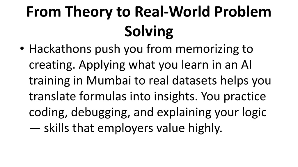 4. From Theory to Real-World Problem Solving • Hackathons push you from memorizing to creating. Applying what you learn in an AI training in Mumbai to real datasets helps you translate formulas into insights. You practice coding, debugging, and explaining your logic — skills that employers value highly.