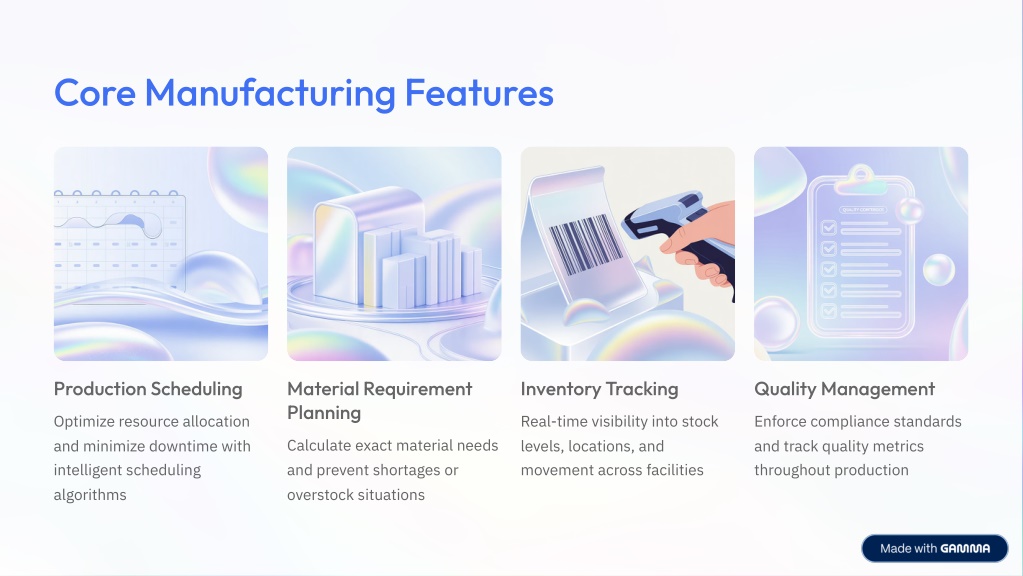 Core Manufacturing Features Production Scheduling Material Requirement Planning Inventory Tracking Quality Management Optimize resource allocation and minimize downtime with intelligent scheduling algorithms Real-time visibility into stock levels, locations, and movement across facilities Enforce compliance standards and track quality metrics throughout production Calculate exact material needs and prevent shortages or overstock situations