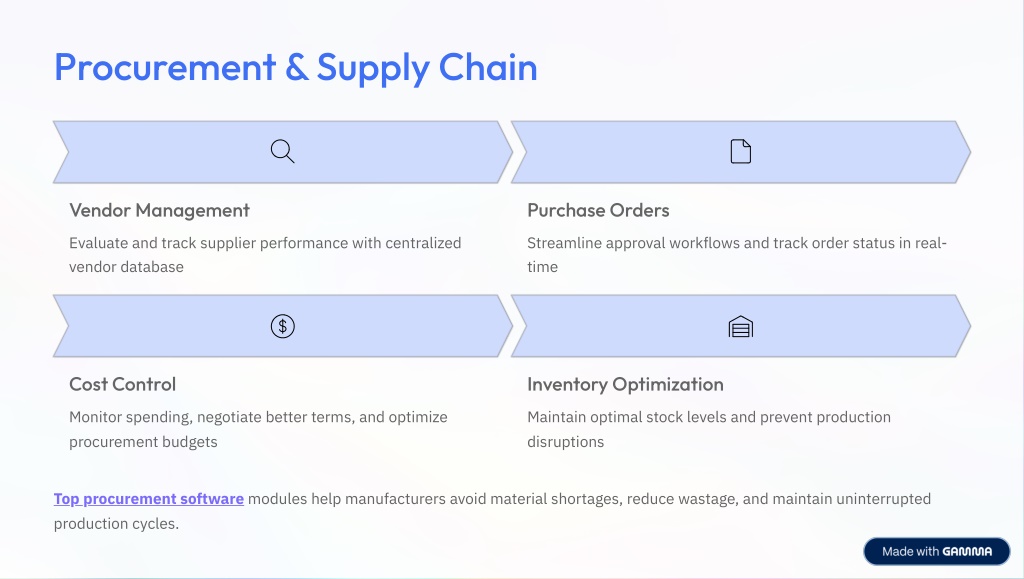 Procurement & Supply Chain Vendor Management Purchase Orders Evaluate and track supplier performance with centralized vendor database Streamline approval workflows and track order status in real- time Cost Control Inventory Optimization Monitor spending, negotiate better terms, and optimize procurement budgets Maintain optimal stock levels and prevent production disruptions Top procurement software modules help manufacturers avoid material shortages, reduce wastage, and maintain uninterrupted production cycles.