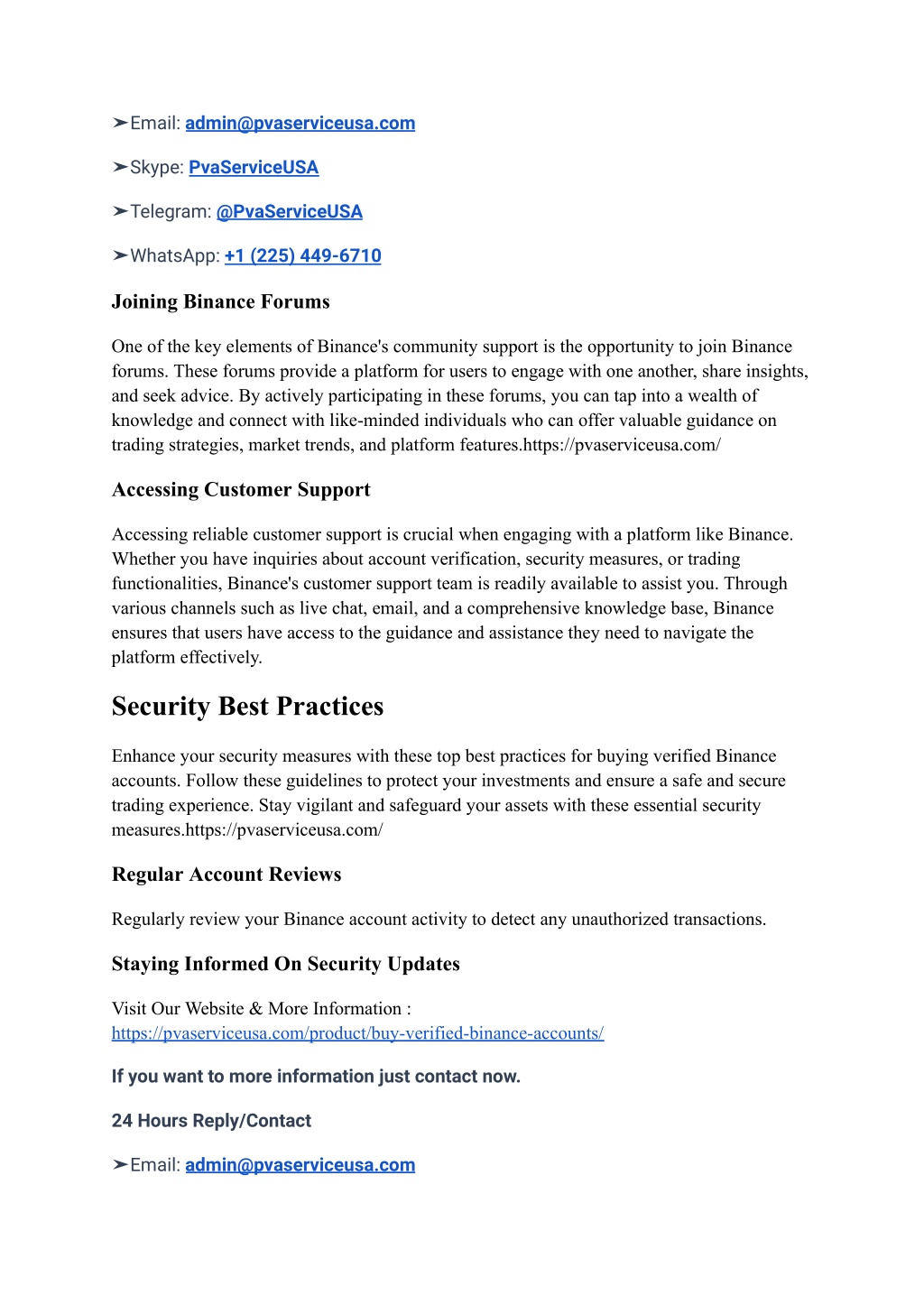 ➤Email: admin@pvaserviceusa.com ➤Skype: PvaServiceUSA ➤Telegram: @PvaServiceUSA ➤WhatsApp: +1 (225) 449-6710 Joining Binance Forums One of the key elements of Binance's community support is the opportunity to join Binance forums. These forums provide a platform for users to engage with one another, share insights, and seek advice. By actively participating in these forums, you can tap into a wealth of knowledge and connect with like-minded individuals who can offer valuable guidance on trading strategies, market trends, and platform features.https://pvaserviceusa.com/ Accessing Customer Support Accessing reliable customer support is crucial when engaging with a platform like Binance. Whether you have inquiries about account verification, security measures, or trading functionalities, Binance's customer support team is readily available to assist you. Through various channels such as live chat, email, and a comprehensive knowledge base, Binance ensures that users have access to the guidance and assistance they need to navigate the platform effectively. Security Best Practices Enhance your security measures with these top best practices for buying verified Binance accounts. Follow these guidelines to protect your investments and ensure a safe and secure trading experience. Stay vigilant and safeguard your assets with these essential security measures.https://pvaserviceusa.com/ Regular Account Reviews Regularly review your Binance account activity to detect any unauthorized transactions. Staying Informed On Security Updates Visit Our Website & More Information : https://pvaserviceusa.com/product/buy-verified-binance-accounts/ If you want to more information just contact now. 24 Hours Reply/Contact ➤Email: admin@pvaserviceusa.com