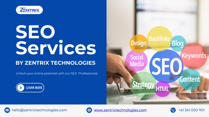 hello@zentrixtechnologies.com www.zentrixtechnologies.com +61 341 000 901 SEO Services BY ZENTRIX TECHNOLOGIES Unlock your online potential with our SEO Professionals +61 341 000 901