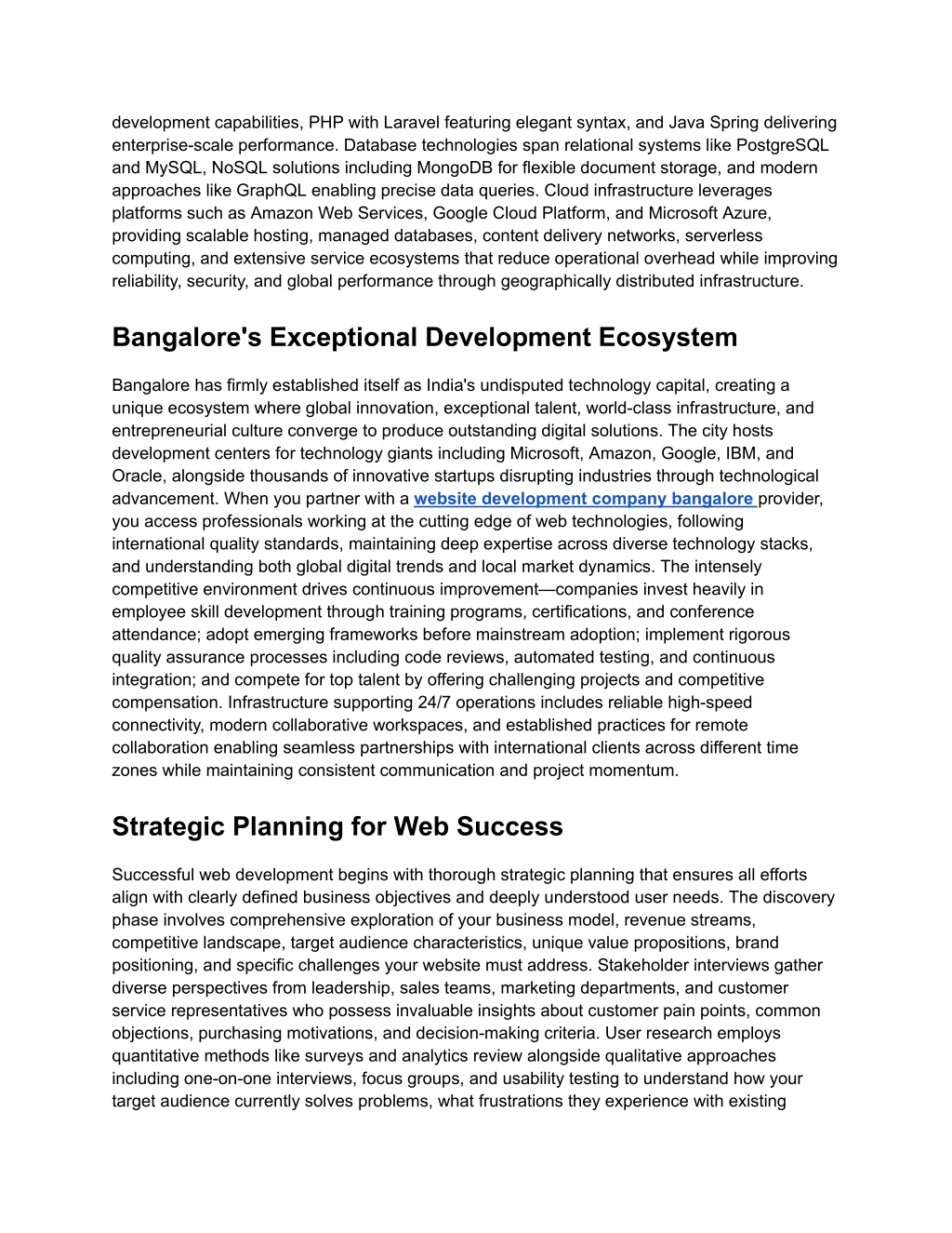 development capabilities, PHP with Laravel featuring elegant syntax, and Java Spring delivering enterprise-scale performance. Database technologies span relational systems like PostgreSQL and MySQL, NoSQL solutions including MongoDB for flexible document storage, and modern approaches like GraphQL enabling precise data queries. Cloud infrastructure leverages platforms such as Amazon Web Services, Google Cloud Platform, and Microsoft Azure, providing scalable hosting, managed databases, content delivery networks, serverless computing, and extensive service ecosystems that reduce operational overhead while improving reliability, security, and global performance through geographically distributed infrastructure. Bangalore's Exceptional Development Ecosystem Bangalore has firmly established itself as India's undisputed technology capital, creating a unique ecosystem where global innovation, exceptional talent, world-class infrastructure, and entrepreneurial culture converge to produce outstanding digital solutions. The city hosts development centers for technology giants including Microsoft, Amazon, Google, IBM, and Oracle, alongside thousands of innovative startups disrupting industries through technological advancement. When you partner with a website development company bangaloreprovider, you access professionals working at the cutting edge of web technologies, following international quality standards, maintaining deep expertise across diverse technology stacks, and understanding both global digital trends and local market dynamics. The intensely competitive environment drives continuous improvement—companies invest heavily in employee skill development through training programs, certifications, and conference attendance; adopt emerging frameworks before mainstream adoption; implement rigorous quality assurance processes including code reviews, automated testing, and continuous integration; and compete for top talent by offering challenging projects and competitive compensation. Infrastructure supporting 24/7 operations includes reliable high-speed connectivity, modern collaborative workspaces, and established practices for remote collaboration enabling seamless partnerships with international clients across different time zones while maintaining consistent communication and project momentum. Strategic Planning for Web Success Successful web development begins with thorough strategic planning that ensures all efforts align with clearly defined business objectives and deeply understood user needs. The discovery phase involves comprehensive exploration of your business model, revenue streams, competitive landscape, target audience characteristics, unique value propositions, brand positioning, and specific challenges your website must address. Stakeholder interviews gather diverse perspectives from leadership, sales teams, marketing departments, and customer service representatives who possess invaluable insights about customer pain points, common objections, purchasing motivations, and decision-making criteria. User research employs quantitative methods like surveys and analytics review alongside qualitative approaches including one-on-one interviews, focus groups, and usability testing to understand how your target audience currently solves problems, what frustrations they experience with existing