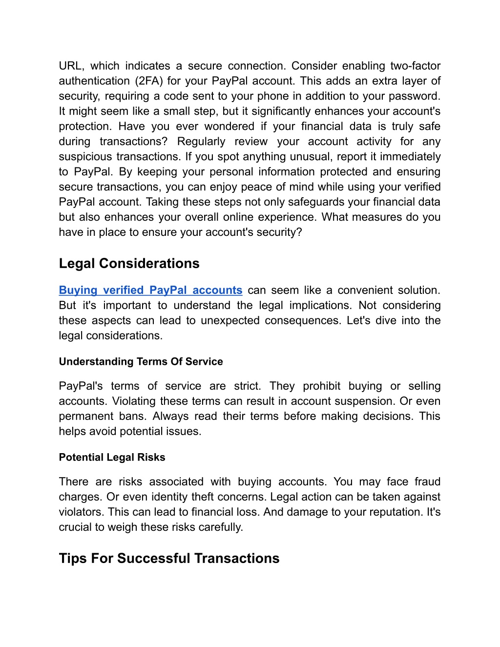 URL, which indicates a secure connection. Consider enabling two-factor authentication (2FA) for your PayPal account. This adds an extra layer of security, requiring a code sent to your phone in addition to your password. It might seem like a small step, but it significantly enhances your account's protection. Have you ever wondered if your financial data is truly safe during transactions? Regularly review your account activity for any suspicious transactions. If you spot anything unusual, report it immediately to PayPal. By keeping your personal information protected and ensuring secure transactions, you can enjoy peace of mind while using your verified PayPal account. Taking these steps not only safeguards your financial data but also enhances your overall online experience. What measures do you have in place to ensure your account's security? Legal Considerations Buying verified PayPal accounts can seem like a convenient solution. But it's important to understand the legal implications. Not considering these aspects can lead to unexpected consequences. Let's dive into the legal considerations. Understanding Terms Of Service PayPal's terms of service are strict. They prohibit buying or selling accounts. Violating these terms can result in account suspension. Or even permanent bans. Always read their terms before making decisions. This helps avoid potential issues. Potential Legal Risks There are risks associated with buying accounts. You may face fraud charges. Or even identity theft concerns. Legal action can be taken against violators. This can lead to financial loss. And damage to your reputation. It's crucial to weigh these risks carefully. Tips For Successful Transactions
