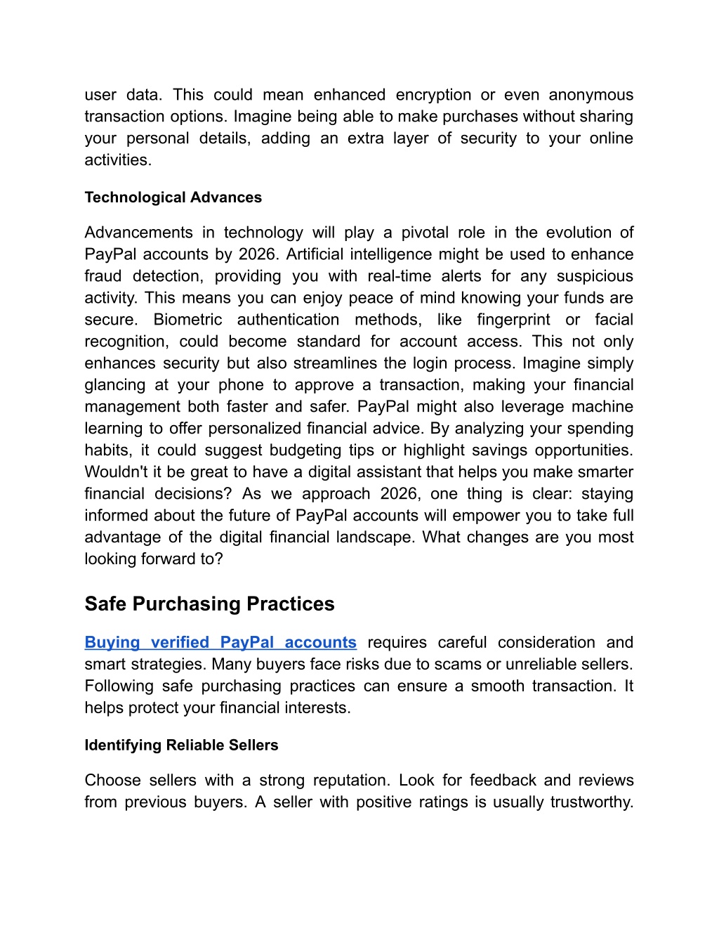 user data. This could mean enhanced encryption or even anonymous transaction options. Imagine being able to make purchases without sharing your personal details, adding an extra layer of security to your online activities. Technological Advances Advancements in technology will play a pivotal role in the evolution of PayPal accounts by 2026. Artificial intelligence might be used to enhance fraud detection, providing you with real-time alerts for any suspicious activity. This means you can enjoy peace of mind knowing your funds are secure. Biometric authentication methods, like fingerprint or facial recognition, could become standard for account access. This not only enhances security but also streamlines the login process. Imagine simply glancing at your phone to approve a transaction, making your financial management both faster and safer. PayPal might also leverage machine learning to offer personalized financial advice. By analyzing your spending habits, it could suggest budgeting tips or highlight savings opportunities. Wouldn't it be great to have a digital assistant that helps you make smarter financial decisions? As we approach 2026, one thing is clear: staying informed about the future of PayPal accounts will empower you to take full advantage of the digital financial landscape. What changes are you most looking forward to? Safe Purchasing Practices Buying verified PayPal accounts requires careful consideration and smart strategies. Many buyers face risks due to scams or unreliable sellers. Following safe purchasing practices can ensure a smooth transaction. It helps protect your financial interests. Identifying Reliable Sellers Choose sellers with a strong reputation. Look for feedback and reviews from previous buyers. A seller with positive ratings is usually trustworthy.