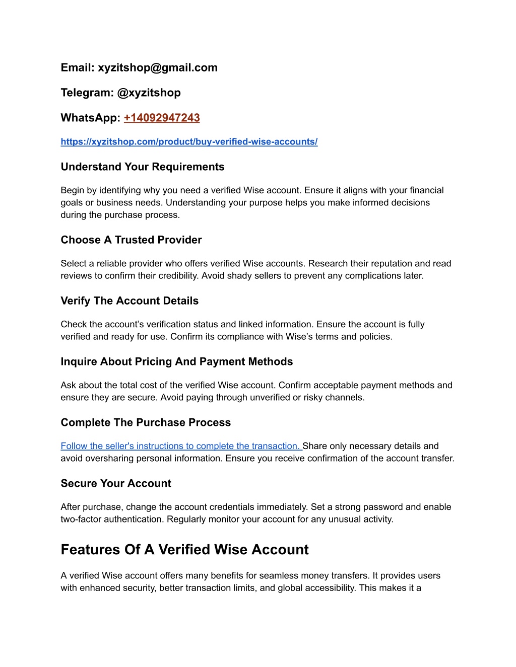 Wise has strict policies against account transfers or sales. Buying an account may breach their terms of service. Breaching terms could lead to account suspension or permanent bans. Always respect the platform's rules for long-term use. Potential Risks Of Fraudulent Accounts Fraudulent or stolen accounts pose serious risks to buyers. These accounts may be flagged or disabled by Wise. You might lose money or face legal consequences. Verify the authenticity of any account before making a purchase. Ethical Responsibility In Financial Transactions Using ethical practices ensures a positive experience in financial dealings. Consider the impact of your actions on others. Supporting unauthorized sales can harm legitimate users and businesses. Make choices that align with honesty and integrity. Ensuring Transparency And Trustworthiness Work only with reputable sellers who provide clear documentation. Authentic sellers will share proof of account verification and ownership. Avoid deals that seem too good to be true. Transparency builds trust and ensures a safer transaction. 24-Hour Reply/Contact Email: xyzitshop@gmail.com Telegram: @xyzitshop WhatsApp: +14092947243 https://xyzitshop.com/product/buy-verified-wise-accounts/ Choosing Trusted Sellers Buying a verified Wise account can simplify your online transactions. But choosing a trustworthy seller is essential for a safe purchase. The right seller ensures you get a legitimate account without risks. Let’s discuss how to identify reliable sellers and make informed decisions. Verify Seller Credentials Always check the seller’s credentials before making a purchase. Look for reviews or feedback from past buyers. A reputable seller will have a proven track record. Avoid sellers with no reviews or negative ratings. Genuine sellers often provide transparent information about their services.