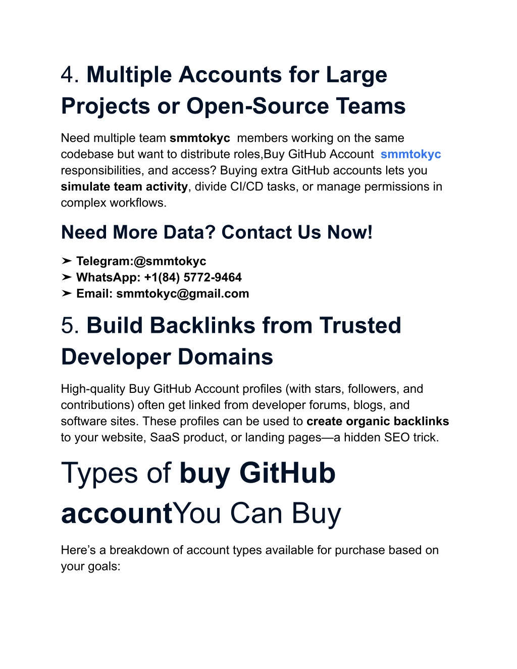 9. Final Verdict – Should You buy GitHub account? Buying GitHub accounts isn’t just a shortcut—it’s a strategy when done right. Whether you’re a: ● Freelancer needing instant credibility ● Tech startup scaling dev automation ● Agency building a client-facing GitHub presence ● Developer running multiple CI/CD pipelines …a high-quality GitHub account can give you a powerful head start. Just make sure you buy smart, stay ethical, and use the account to deliver real value—not just appearances. Need More Data? Contact Us Now! ➤ Telegram:@smmtokyc ➤ WhatsApp: +1(84) 5772-9464 ➤ Email: smmtokyc@gmail.com Summary: Quick Benefits of buy GitHub account ● Gain instant reputation and activity history ● Avoid restrictions on new accounts ● Speed up GitHub Actions and automation ● Create client portfolios without waiting months ● Use aged accounts for SEO and branding ● Improve trust on freelancer platforms