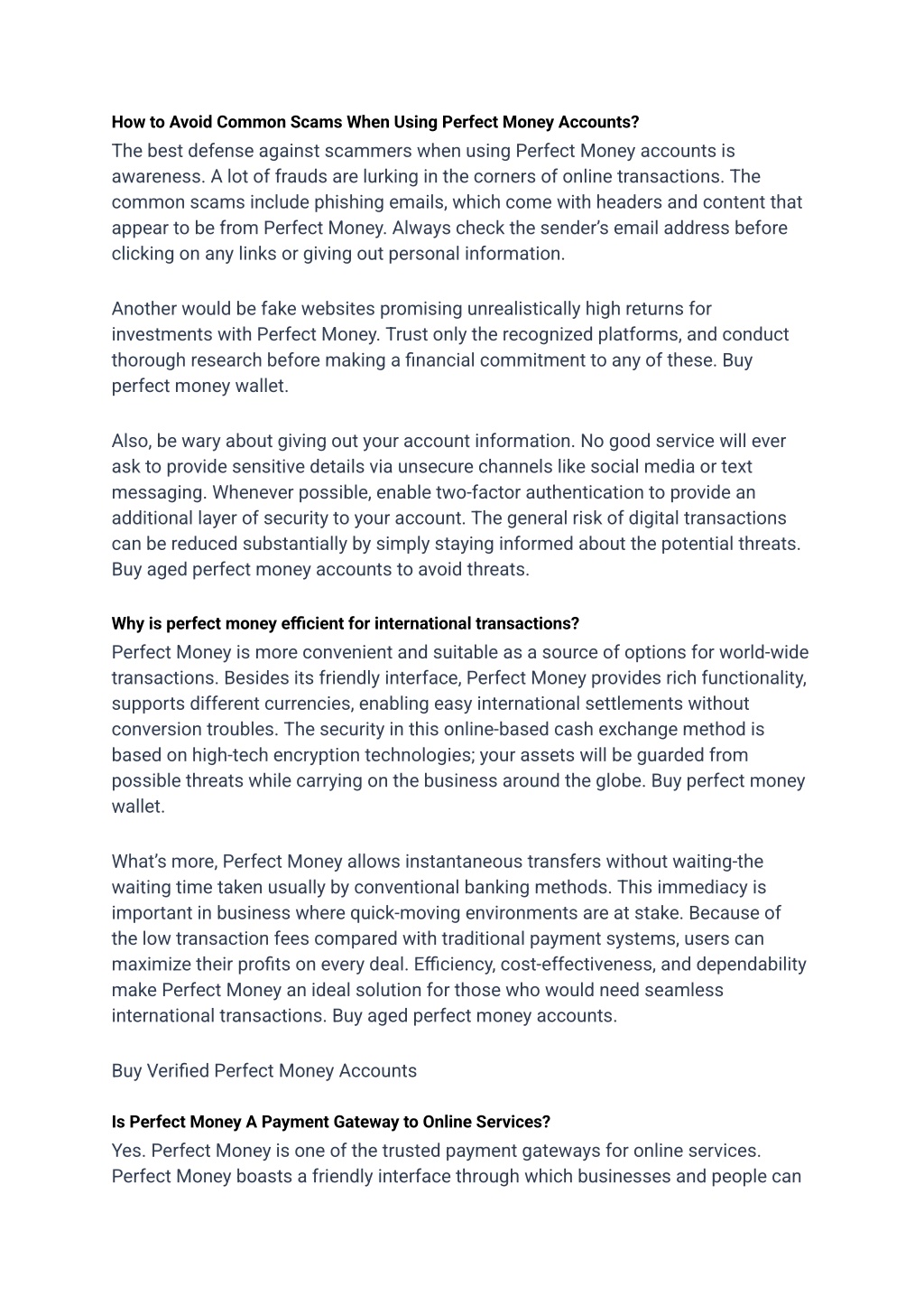 How to Avoid Common Scams When Using Perfect Money Accounts? The best defense against scammers when using Perfect Money accounts is awareness. A lot of frauds are lurking in the corners of online transactions. The common scams include phishing emails, which come with headers and content that appear to be from Perfect Money. Always check the sender’s email address before clicking on any links or giving out personal information. Another would be fake websites promising unrealistically high returns for investments with Perfect Money. Trust only the recognized platforms, and conduct thorough research before making a financial commitment to any of these. Buy perfect money wallet. Also, be wary about giving out your account information. No good service will ever ask to provide sensitive details via unsecure channels like social media or text messaging. Whenever possible, enable two-factor authentication to provide an additional layer of security to your account. The general risk of digital transactions can be reduced substantially by simply staying informed about the potential threats. Buy aged perfect money accounts to avoid threats. Why is perfect money efficient for international transactions? Perfect Money is more convenient and suitable as a source of options for world-wide transactions. Besides its friendly interface, Perfect Money provides rich functionality, supports different currencies, enabling easy international settlements without conversion troubles. The security in this online-based cash exchange method is based on high-tech encryption technologies; your assets will be guarded from possible threats while carrying on the business around the globe. Buy perfect money wallet. What’s more, Perfect Money allows instantaneous transfers without waiting-the waiting time taken usually by conventional banking methods. This immediacy is important in business where quick-moving environments are at stake. Because of the low transaction fees compared with traditional payment systems, users can maximize their profits on every deal. Efficiency, cost-effectiveness, and dependability make Perfect Money an ideal solution for those who would need seamless international transactions. Buy aged perfect money accounts. Buy Verified Perfect Money Accounts Is Perfect Money A Payment Gateway to Online Services? Yes. Perfect Money is one of the trusted payment gateways for online services. Perfect Money boasts a friendly interface through which businesses and people can