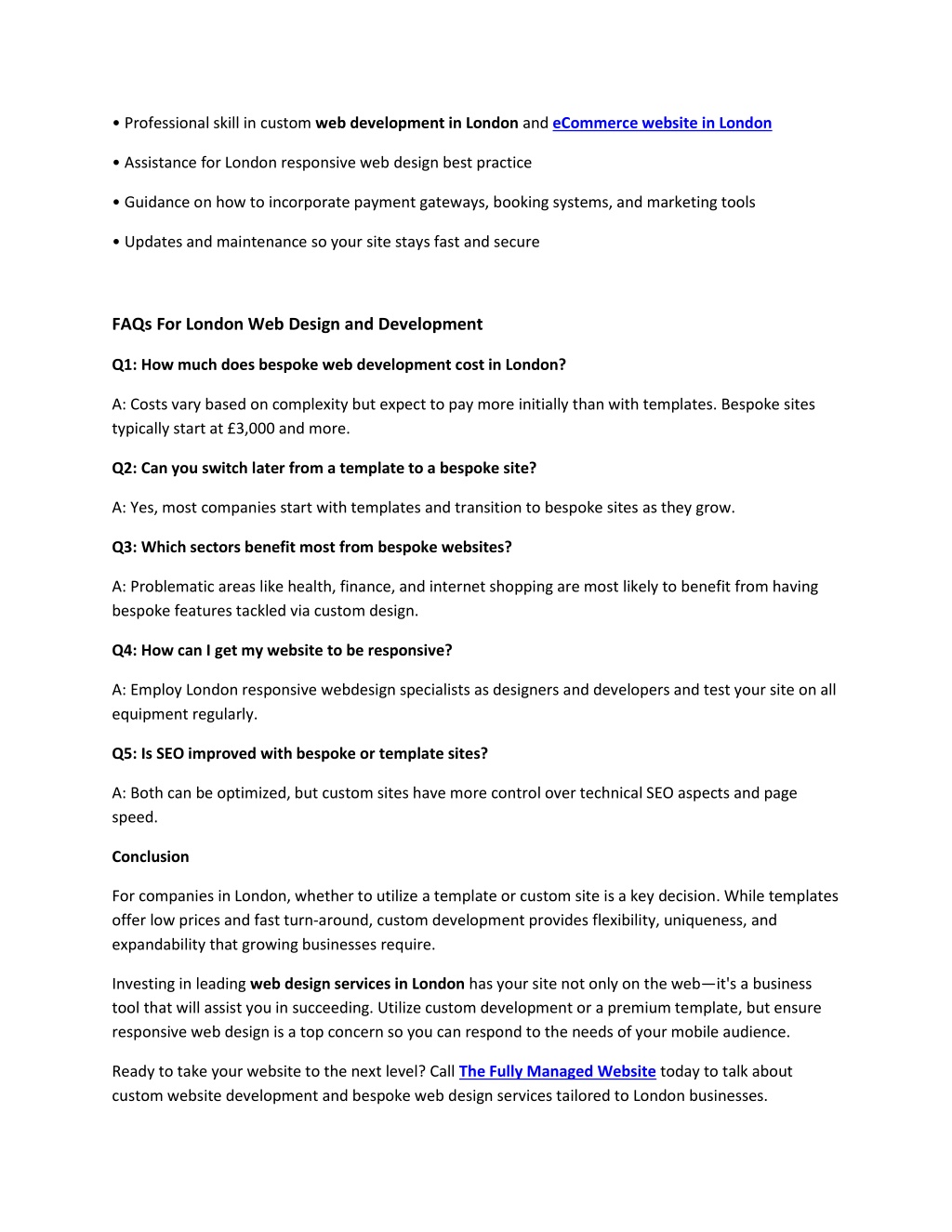 • Professional skill in custom web development in London and eCommerce website in London • Assistance for London responsive web design best practice • Guidance on how to incorporate payment gateways, booking systems, and marketing tools • Updates and maintenance so your site stays fast and secure FAQs For London Web Design and Development Q1: How much does bespoke web development cost in London? A: Costs vary based on complexity but expect to pay more initially than with templates. Bespoke sites typically start at £3,000 and more. Q2: Can you switch later from a template to a bespoke site? A: Yes, most companies start with templates and transition to bespoke sites as they grow. Q3: Which sectors benefit most from bespoke websites? A: Problematic areas like health, finance, and internet shopping are most likely to benefit from having bespoke features tackled via custom design. Q4: How can I get my website to be responsive? A: Employ London responsive webdesign specialists as designers and developers and test your site on all equipment regularly. Q5: Is SEO improved with bespoke or template sites? A: Both can be optimized, but custom sites have more control over technical SEO aspects and page speed. Conclusion For companies in London, whether to utilize a template or custom site is a key decision. While templates offer low prices and fast turn-around, custom development provides flexibility, uniqueness, and expandability that growing businesses require. Investing in leading web design services in London has your site not only on the web—it's a business tool that will assist you in succeeding. Utilize custom development or a premium template, but ensure responsive web design is a top concern so you can respond to the needs of your mobile audience. Ready to take your website to the next level? Call The Fully Managed Website today to talk about custom website development and bespoke web design services tailored to London businesses.
