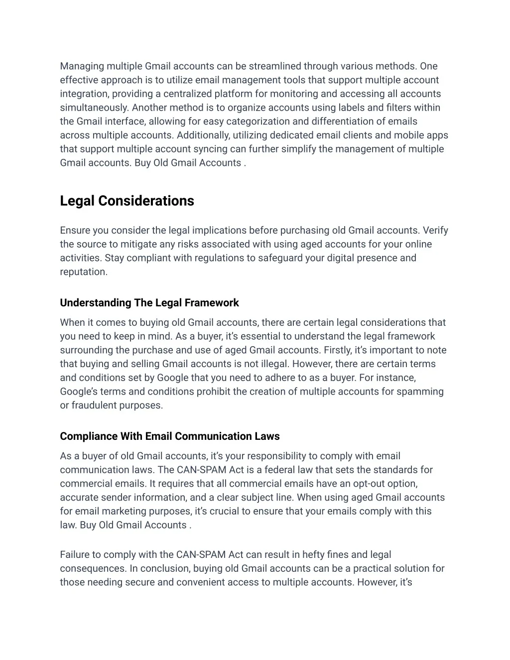 Managing multiple Gmail accounts can be streamlined through various methods. One effective approach is to utilize email management tools that support multiple account integration, providing a centralized platform for monitoring and accessing all accounts simultaneously. Another method is to organize accounts using labels and filters within the Gmail interface, allowing for easy categorization and differentiation of emails across multiple accounts. Additionally, utilizing dedicated email clients and mobile apps that support multiple account syncing can further simplify the management of multiple Gmail accounts. Buy Old Gmail Accounts . Legal Considerations Ensure you consider the legal implications before purchasing old Gmail accounts. Verify the source to mitigate any risks associated with using aged accounts for your online activities. Stay compliant with regulations to safeguard your digital presence and reputation. Understanding The Legal Framework When it comes to buying old Gmail accounts, there are certain legal considerations that you need to keep in mind. As a buyer, it’s essential to understand the legal framework surrounding the purchase and use of aged Gmail accounts. Firstly, it’s important to note that buying and selling Gmail accounts is not illegal. However, there are certain terms and conditions set by Google that you need to adhere to as a buyer. For instance, Google’s terms and conditions prohibit the creation of multiple accounts for spamming or fraudulent purposes. Compliance With Email Communication Laws As a buyer of old Gmail accounts, it’s your responsibility to comply with email communication laws. The CAN-SPAM Act is a federal law that sets the standards for commercial emails. It requires that all commercial emails have an opt-out option, accurate sender information, and a clear subject line. When using aged Gmail accounts for email marketing purposes, it’s crucial to ensure that your emails comply with this law. Buy Old Gmail Accounts . Failure to comply with the CAN-SPAM Act can result in hefty fines and legal consequences. In conclusion, buying old Gmail accounts can be a practical solution for those needing secure and convenient access to multiple accounts. However, it’s
