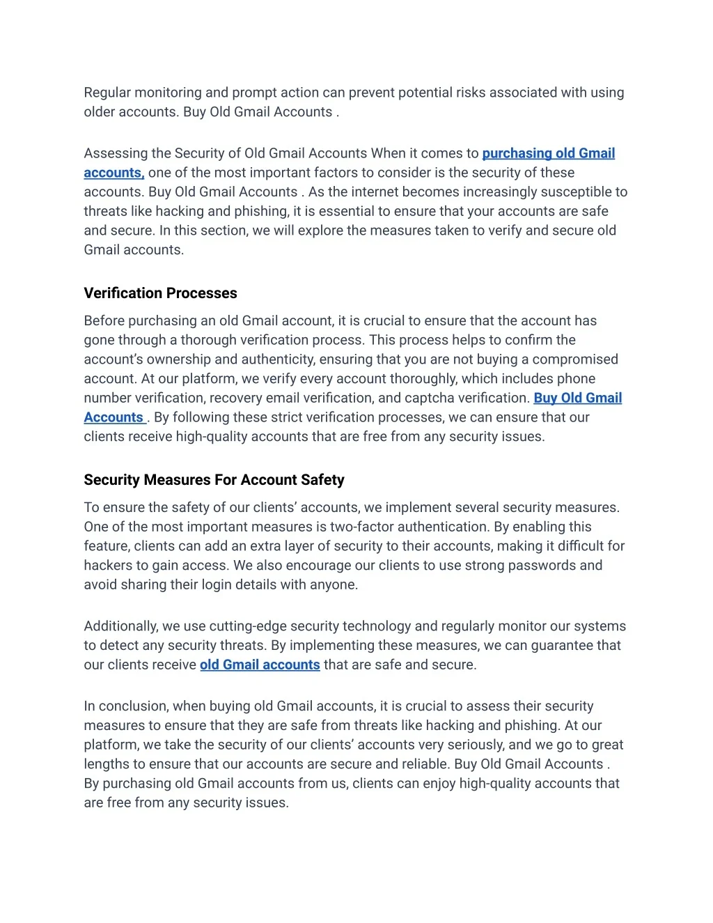 reduction in spam complaints and an increase in customer engagement. These accounts have proven to be a worthwhile investment.” Potential Risks And Pitfalls When considering buying old Gmail accounts, it is crucial to be aware of the potential risks and pitfalls associated with this practice. Buy Old Gmail Accounts . Understanding these risks can help you make informed decisions and avoid potential complications. Common Challenges Encountered ● Account Suspension: Purchased accounts may violate Gmail’s terms of service, leading to suspension. ● Security Concerns: Old accounts may have outdated security measures, making them vulnerable to hacking. ● Quality Issues: Some bought accounts may have low inbox rates or poor performance. Strategies To Mitigate Risks 1. Source Verification: Ensure you buy old Gmail accounts from reputable and verified sources. 2. Security Updates: Immediately update the purchased accounts with strong passwords and security settings. 3. Regular Monitoring: Keep a close eye on the account activity to detect any suspicious behavior. By being aware of these risks and pitfalls and implementing strategic mitigation strategies, you can navigate the process of buying old Gmail accounts more effectively and minimize potential issues. The Role Of Customer Support The Role of Customer Support plays a crucial part in the process of buying old Gmail accounts. It ensures that customers receive the necessary assistance before, during,
