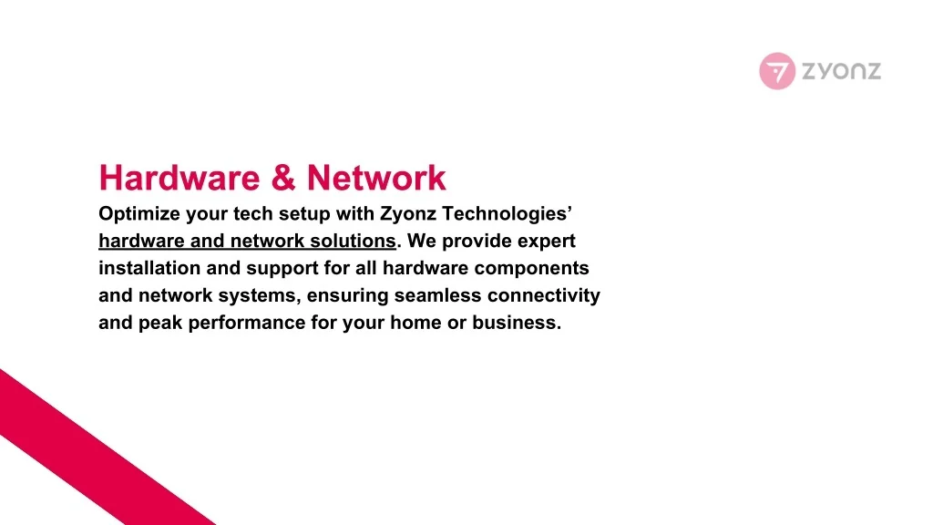 Hardware & Network Optimize your tech setup with Zyonz Technologies’ hardware and network solutions. We provide expert installation and support for all hardware components and network systems, ensuring seamless connectivity and peak performance for your home or business.