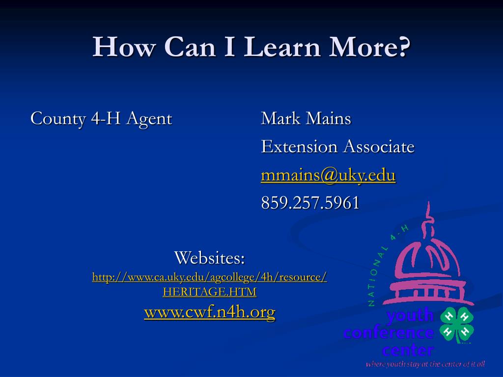 County 4-H Agent Mark Mains Extension Associate mmains@uky.edu 859.257.5961 How Can I Learn More? Websites: http://www.ca.uky.edu/agcollege/4h/resource/HERITAGE.HTM www.cwf.n4h.org