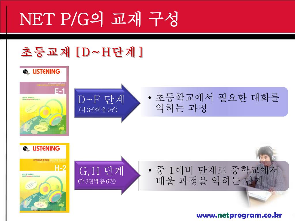 NET P/G의 교재 구성 초등교재 [D~H단계] G,H 단계 (각 3권씩 총 6권) D~F 단계 (각 3권씩 총 9권) • 초등학교에서 필요한 대화를 익히는 과정 • 중 1예비 단계로 중학교에서 배울 과정을 익히는 단계 www.netprogram.co.kr