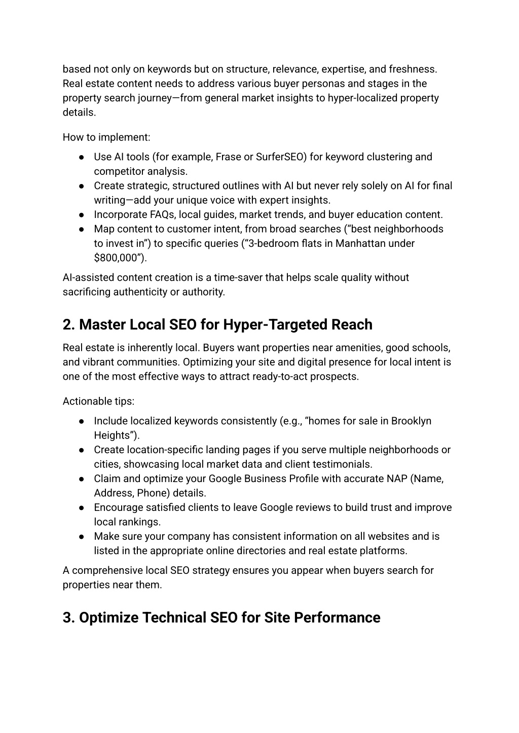 based not only on keywords but on structure, relevance, expertise, and freshness. Real estate content needs to address various buyer personas and stages in the property search journey—from general market insights to hyper-localized property details. How to implement: ● Use AI tools (for example, Frase or SurferSEO) for keyword clustering and competitor analysis. ● Create strategic, structured outlines with AI but never rely solely on AI for final writing—add your unique voice with expert insights. ● Incorporate FAQs, local guides, market trends, and buyer education content. ● Map content to customer intent, from broad searches (“best neighborhoods to invest in”) to specific queries (“3-bedroom flats in Manhattan under $800,000”). AI-assisted content creation is a time-saver that helps scale quality without sacrificing authenticity or authority. 2. Master Local SEO for Hyper-Targeted Reach Real estate is inherently local. Buyers want properties near amenities, good schools, and vibrant communities. Optimizing your site and digital presence for local intent is one of the most effective ways to attract ready-to-act prospects. Actionable tips: ● Include localized keywords consistently (e.g., “homes for sale in Brooklyn Heights”). ● Create location-specific landing pages if you serve multiple neighborhoods or cities, showcasing local market data and client testimonials. ● Claim and optimize your Google Business Profile with accurate NAP (Name, Address, Phone) details. ● Encourage satisfied clients to leave Google reviews to build trust and improve local rankings. ● Make sure your company has consistent information on all websites and is listed in the appropriate online directories and real estate platforms. A comprehensive local SEO strategy ensures you appear when buyers search for properties near them. 3. Optimize Technical SEO for Site Performance