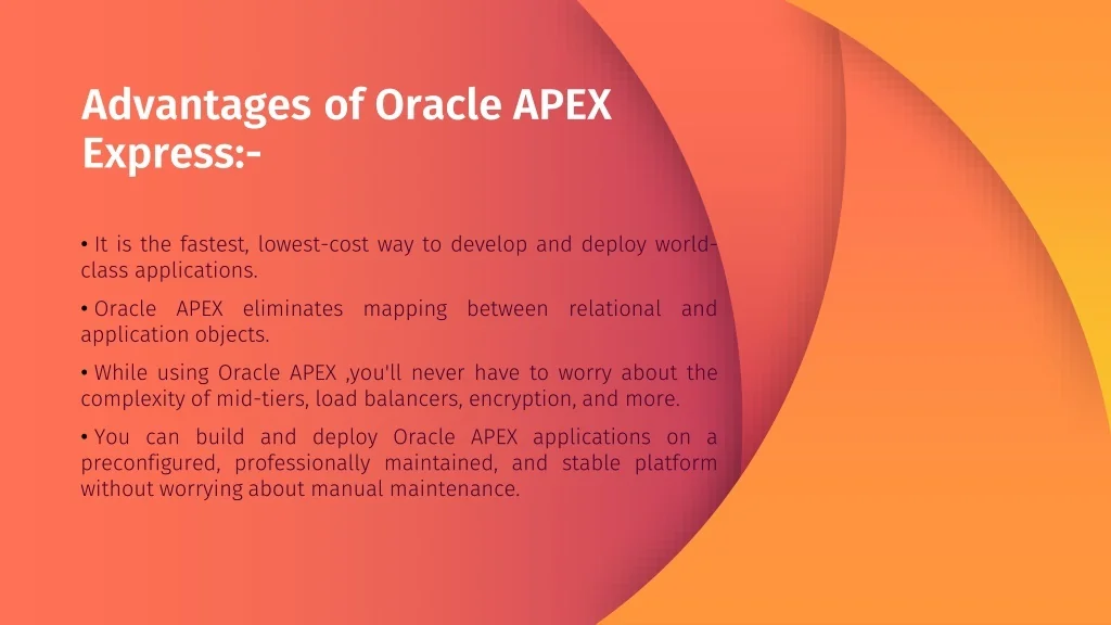 It is the fastest, lowest-cost way to develop and deploy world-class applications. • Oracle APEX eliminates mapping between relational and application objects. • While using Oracle APEX ,you'll never have to worry about the complexity of mid-tiers, load balancers, encryption, and more. • You can build and deploy Oracle APEX applications on a preconfigured, professionally maintained, and stable platform without worrying about manual maintenance. Advantagesof Oracle APEX Express:-