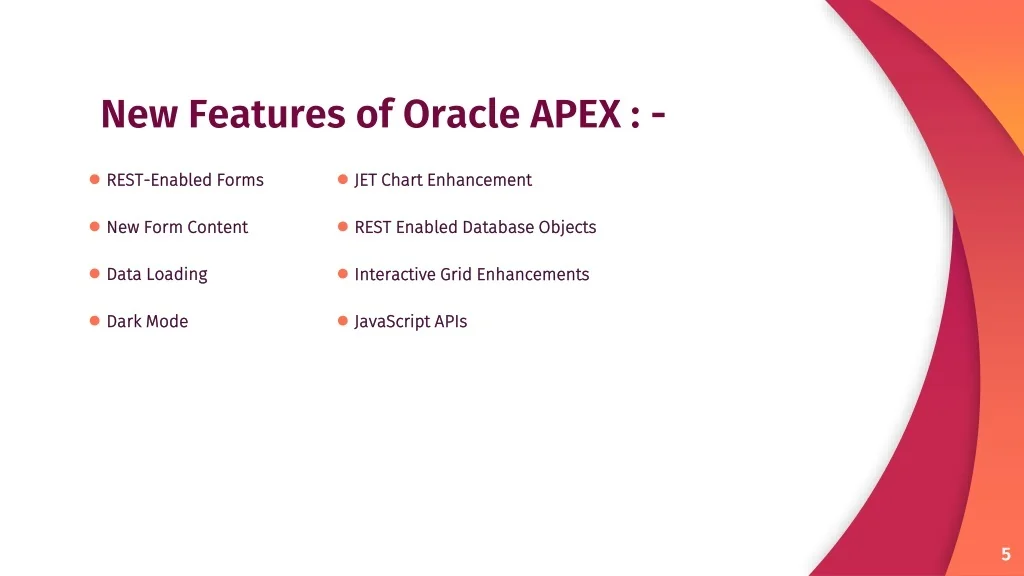 New Features of Oracle APEX : - • REST-Enabled Forms • New Form Content • Data Loading • Dark Mode • JET Chart Enhancement • REST Enabled Database Objects • Interactive Grid Enhancements • JavaScript APIs