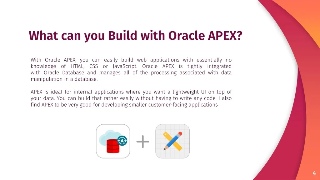 What can you Build with Oracle APEX? With Oracle APEX, you can easily build web applications with essentially no knowledge of HTML, CSS or JavaScript. Oracle APEX is tightly integrated with Oracle Database and manages all of the processing associated with data manipulation in a database. APEX is ideal for internal applications where you want a lightweight UI on top of your data. You can build that rather easily without having to write any code. I also find APEX to be very good for developing smaller customer-facing applications