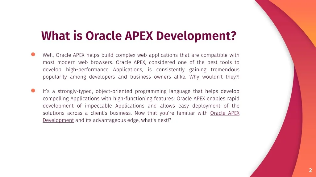 What is Oracle APEX Development? • Well, Oracle APEX helps build complex web applications that are compatible with most modern web browsers. Oracle APEX, considered one of the best tools to develop high-performance Applications, is consistently gaining tremendous popularity among developers and business owners alike. Why wouldn’t they?! • It’s a strongly-typed, object-oriented programming language that helps develop compelling Applications with high-functioning features! Oracle APEX enables rapid development of impeccable Applications and allows easy deployment of the solutions across a client’s business. Now that you’re familiar with Oracle APEX Development and its advantageous edge, what’s next!?
