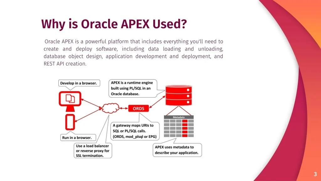 Why is Oracle APEX Used? Oracle APEX is a powerful platform that includes everything you'll need to create and deploy software, including data loading and unloading, database object design, application development and deployment, and REST API creation.