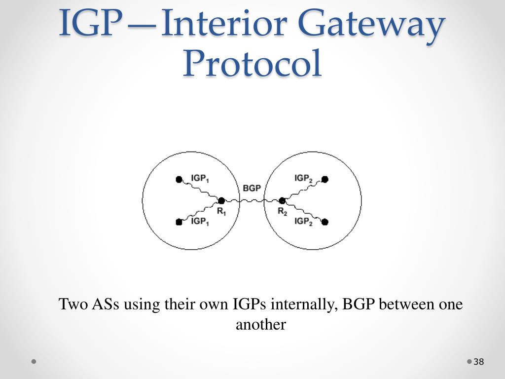 IGP—Interior Gateway Protocol Two ASs using their own IGPs internally, BGP between one another