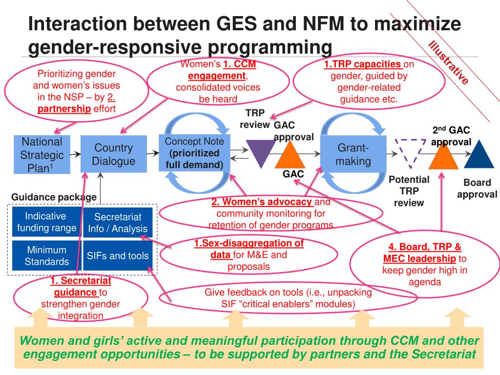 Illustrative Interaction between GES and NFM to maximize gender-responsive programming 1.TRP capacities on gender, guided by gender-related guidance etc. Women’s 1. CCM engagement, consolidated voices be heard Prioritizing gender and women’s issues in the NSP – by 2. partnership effort TRP review GAC approval 2nd GAC approval Concept Note (prioritized full demand) National Strategic Plan1 Country Dialogue Grant-making GAC Potential TRP review Board approval Guidance package Indicative funding range Secretariat Info / Analysis 2. Women’s advocacy and community monitoring for retention of gender programs 4. Board, TRP & MEC leadership to keep gender high in agenda Minimum Standards SIFs and tools 1.Sex-disaggregation of data for M&E and proposals 1. Secretariat guidance to strengthen gender integration Give feedback on tools (i.e., unpacking SIF “critical enablers” modules) Women and girls’ active and meaningful participation through CCM and other engagement opportunities – to be supported by partners and the Secretariat