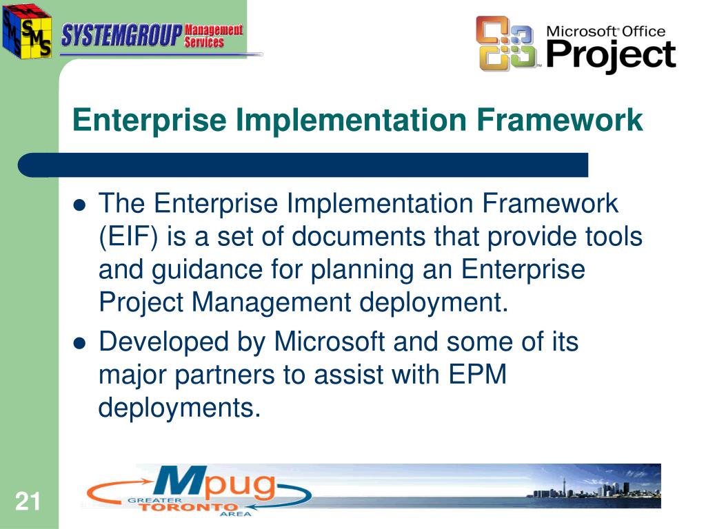 Enterprise Implementation Framework • The Enterprise Implementation Framework (EIF) is a set of documents that provide tools and guidance for planning an Enterprise Project Management deployment. • Developed by Microsoft and some of its major partners to assist with EPM deployments.