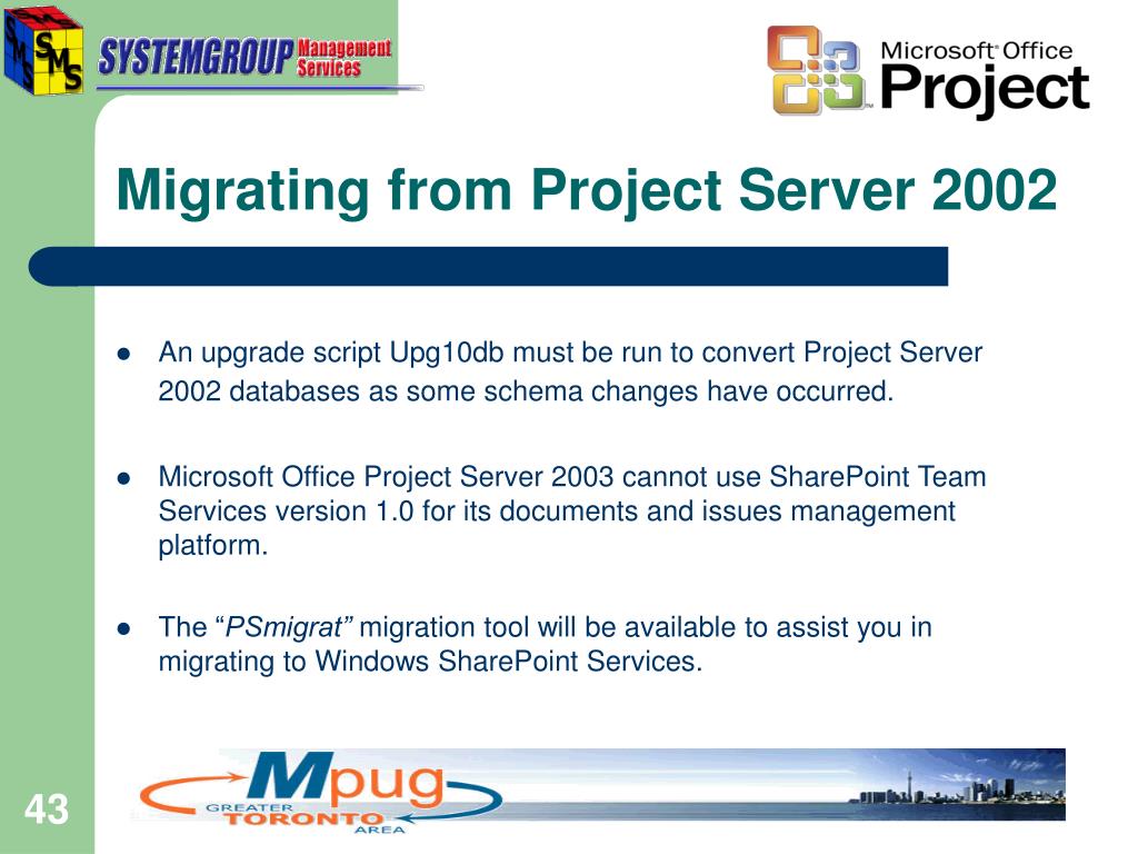 Migrating from Project Server 2002 • An upgrade script Upg10db must be run to convert Project Server 2002 databases as some schema changes have occurred. • Microsoft Office Project Server 2003 cannot use SharePoint Team Services version 1.0 for its documents and issues management platform. • The “PSmigrat” migration tool will be available to assist you in migrating to Windows SharePoint Services.