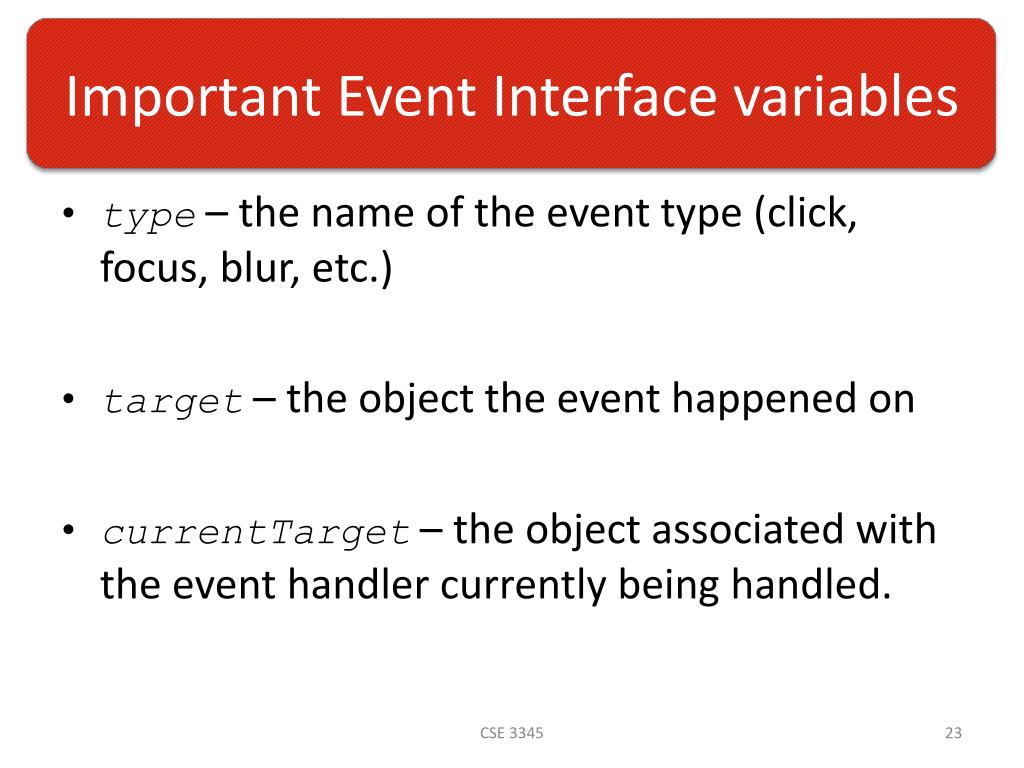 Important Event Interface variables • type – the name of the event type (click, focus, blur, etc.) • target – the object the event happened on • currentTarget – the object associated with the event handler currently being handled. CSE 3345