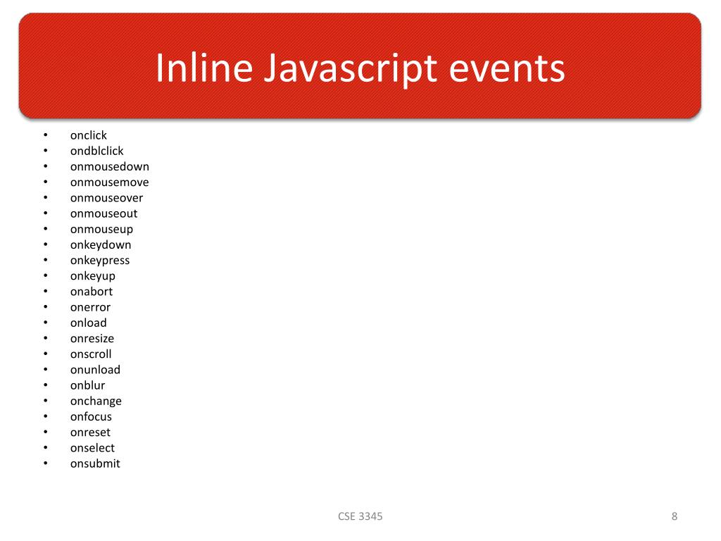 Inline Javascript events • onclick • ondblclick • onmousedown • onmousemove • onmouseover • onmouseout • onmouseup • onkeydown • onkeypress • onkeyup • onabort • onerror • onload • onresize • onscroll • onunload • onblur • onchange • onfocus • onreset • onselect • onsubmit CSE 3345