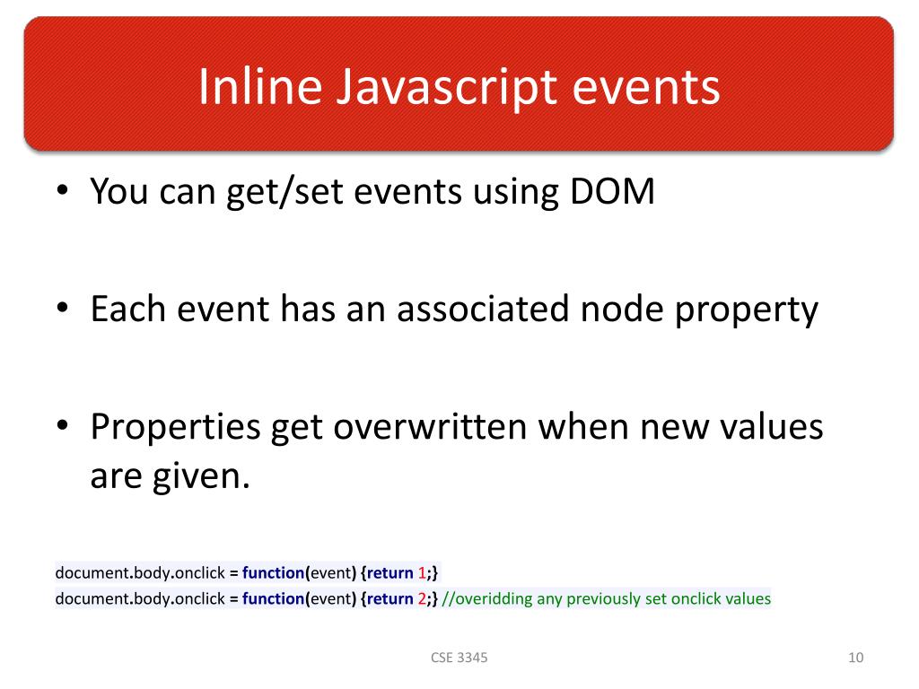 Inline Javascript events • You can get/set events using DOM • Each event has an associated node property • Properties get overwritten when new values are given. document.body.onclick=function(event){return1;} document.body.onclick=function(event){return2;}//overidding any previously set onclick values CSE 3345