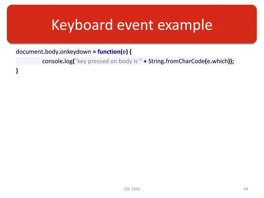Keyboard event example document.body.onkeydown=function(e){ console.log("key pressed on body is "+String.fromCharCode(e.which)); } CSE 3345