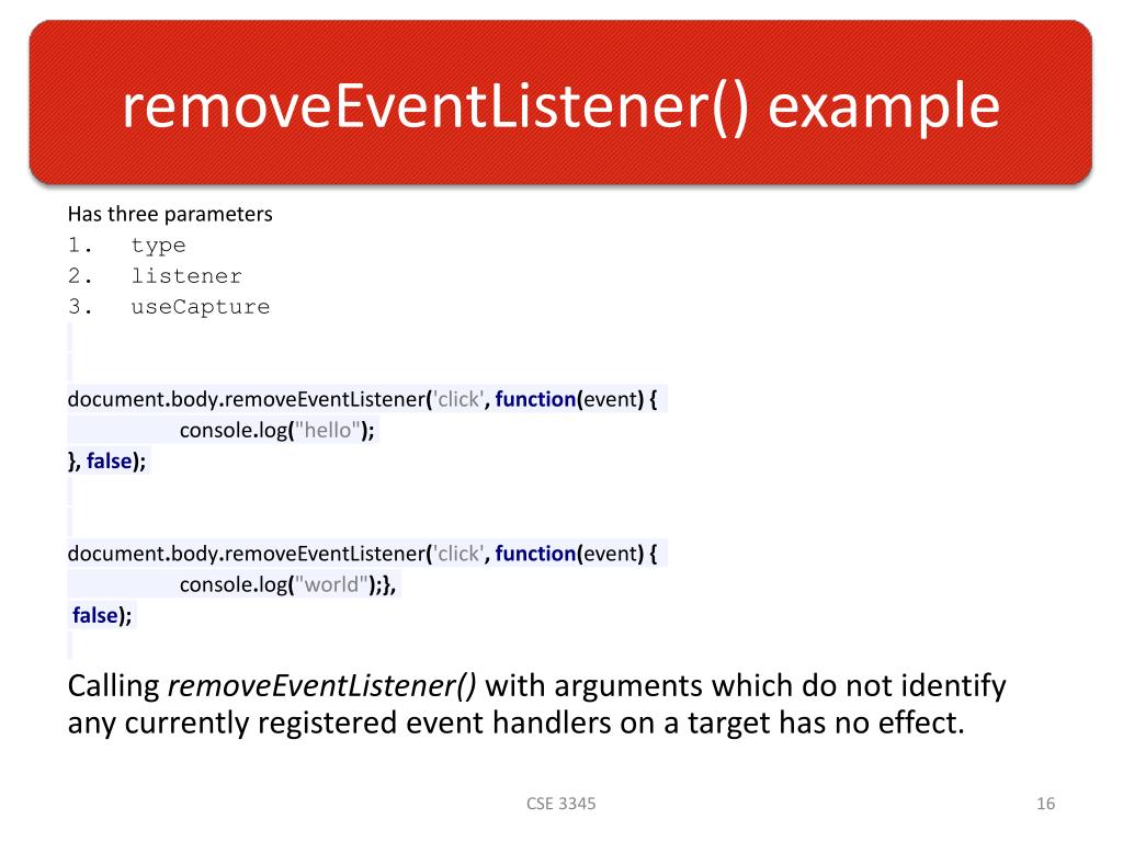removeEventListener() example Has three parameters • type • listener • useCapture document.body.removeEventListener('click',function(event){ console.log("hello"); },false); document.body.removeEventListener('click',function(event){ console.log("world");}, false); Calling removeEventListener() with arguments which do not identify any currently registered event handlers on a target has no effect. CSE 3345