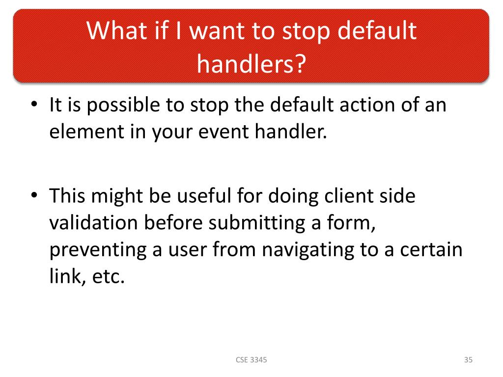 What if I want to stop default handlers? • It is possible to stop the default action of an element in your event handler. • This might be useful for doing client side validation before submitting a form, preventing a user from navigating to a certain link, etc. CSE 3345