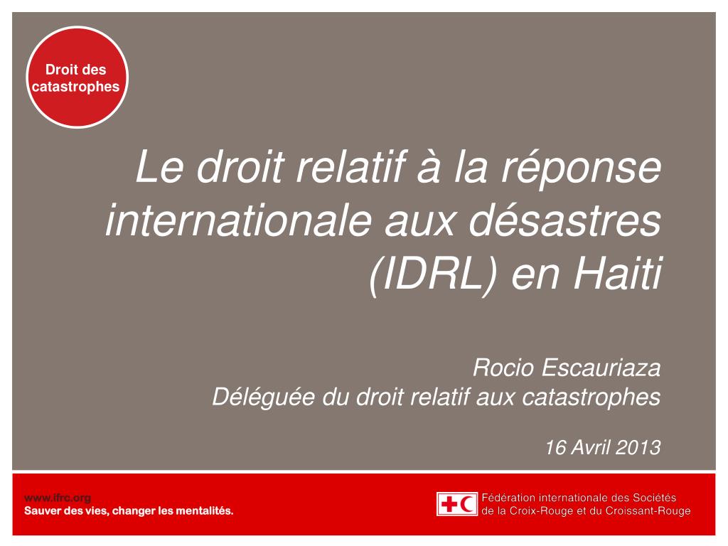 Le droit relatif à la réponse internationale aux désastres (IDRL) en HaitiRocio EscauriazaDéléguée du droit relatif aux catastrophes16 Avril 2013