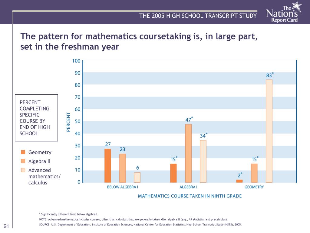 Geometry Algebra II Advancedmathematics/calculus The pattern for mathematics coursetaking is, in large part,set in the freshman year PERCENT COMPLETING SPECIFIC COURSE BY END OF HIGH SCHOOL * Significantly different from below algebra I. NOTE: Advanced mathematics includes courses, other than calculus, that are generally taken after algebra II (e.g., AP statistics and precalculus). SOURCE: U.S. Department of Education, Institute of Education Sciences, National Center for Education Statistics, High School Transcript Study (HSTS), 2005.
