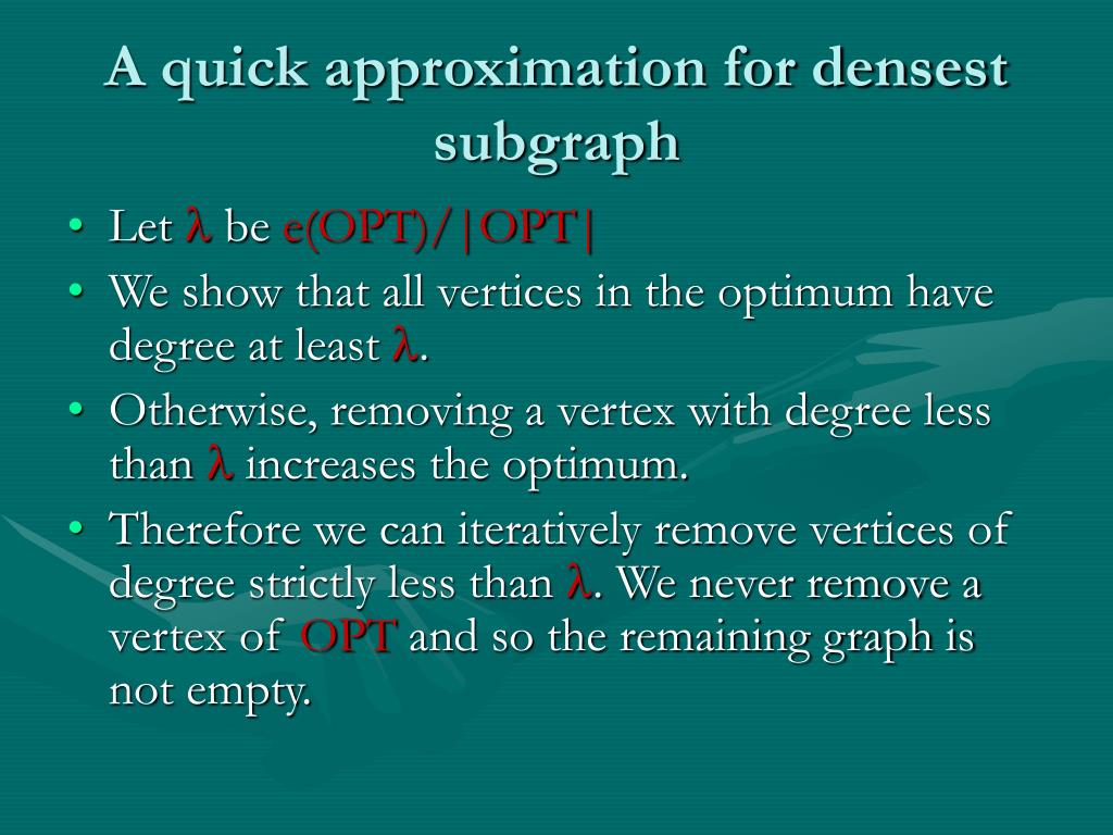 A quick approximation for densest subgraph • Let be e(OPT)/|OPT| • We show that all vertices in the optimum have degree at least . • Otherwise, removing a vertex with degree less than increases the optimum. • Therefore we can iteratively remove vertices of degree strictly less than . We never remove a vertex of OPT and so the remaining graph is not empty.